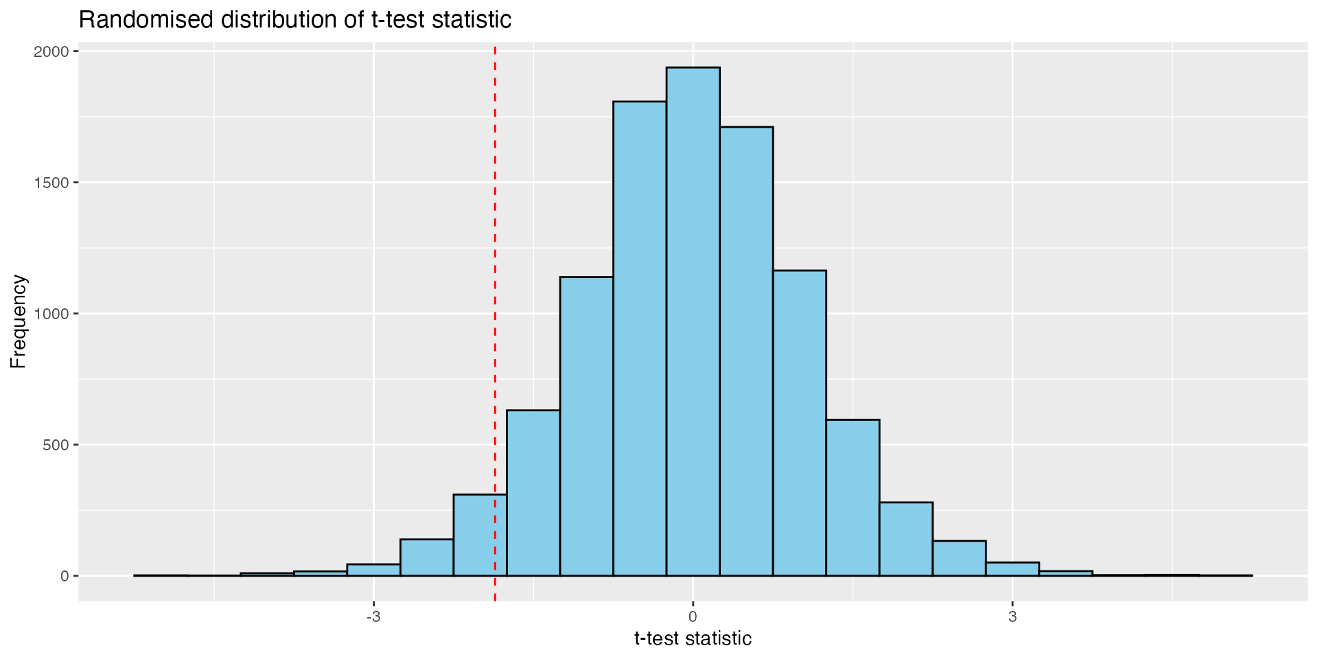 Finally, we can compare the observed test statistic to the randomised distribution. This can be done by calculating the proportion of randomised test statistics that are more extreme than the observed test statistic.