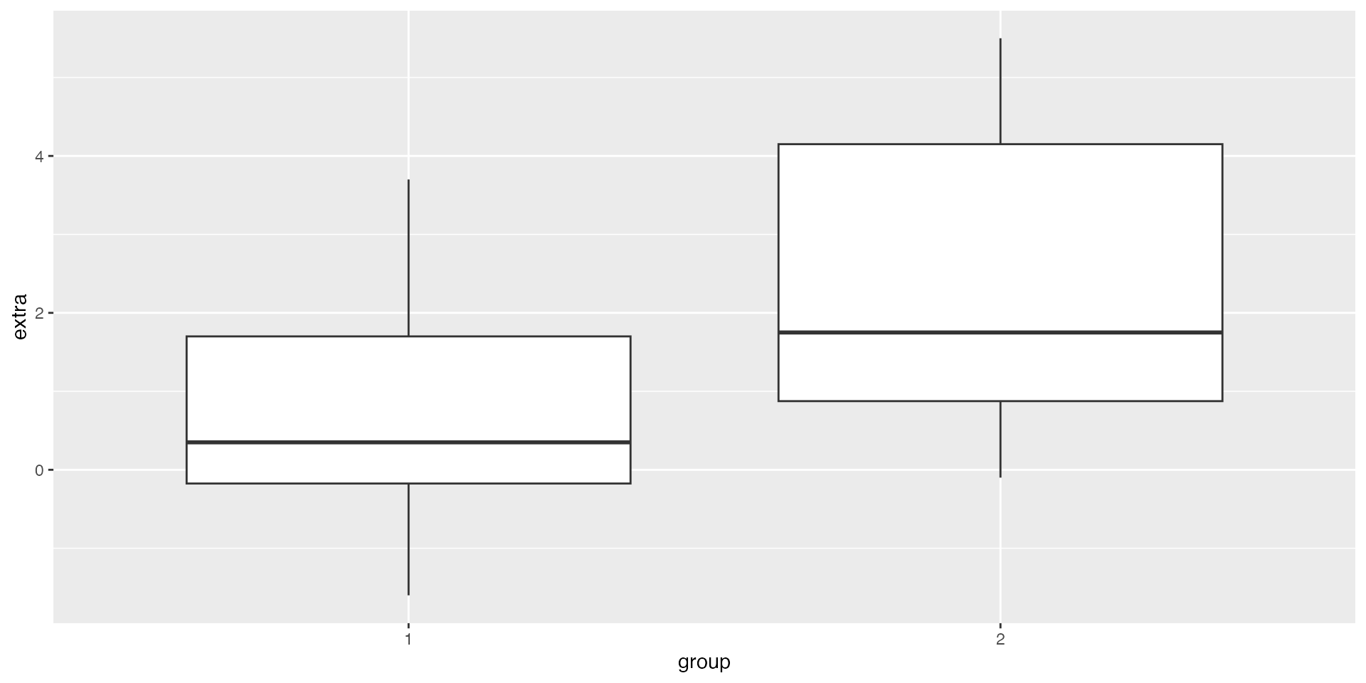 The sleep dataset in R contains the average extra hours of sleep, compared to control, for 10 patients who were given two different drugs.