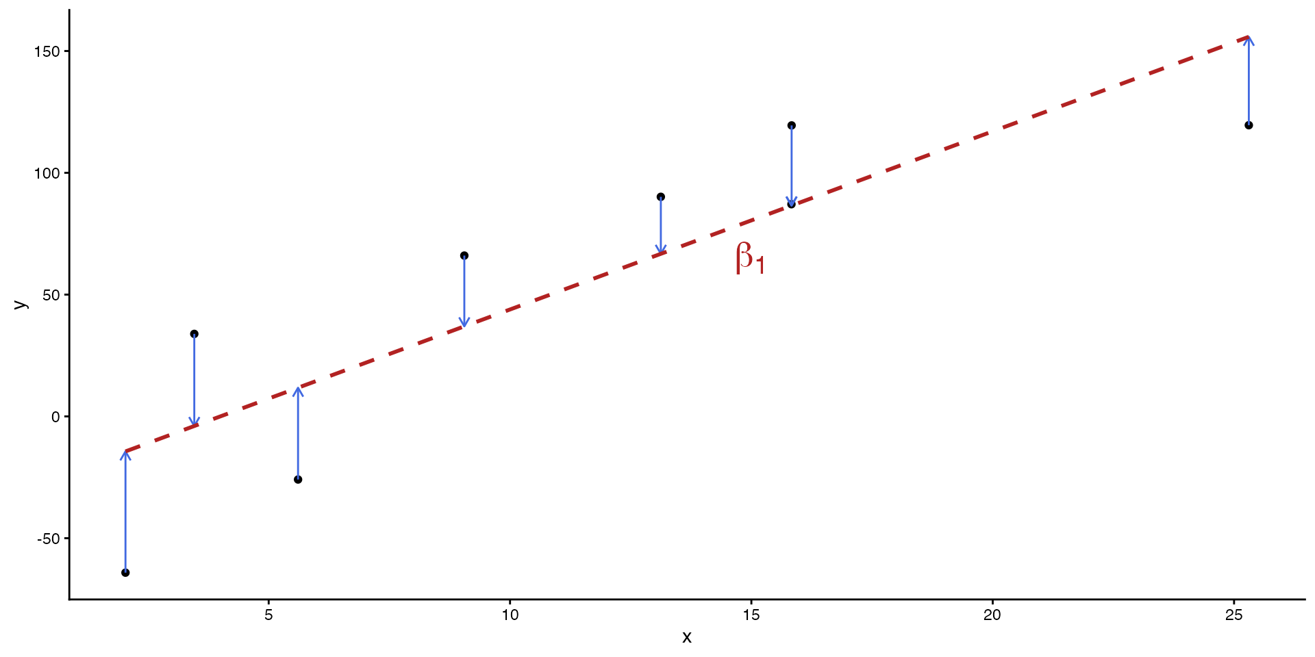 # beta0 <- mean(df$y) - beta1 * mean(df$x)