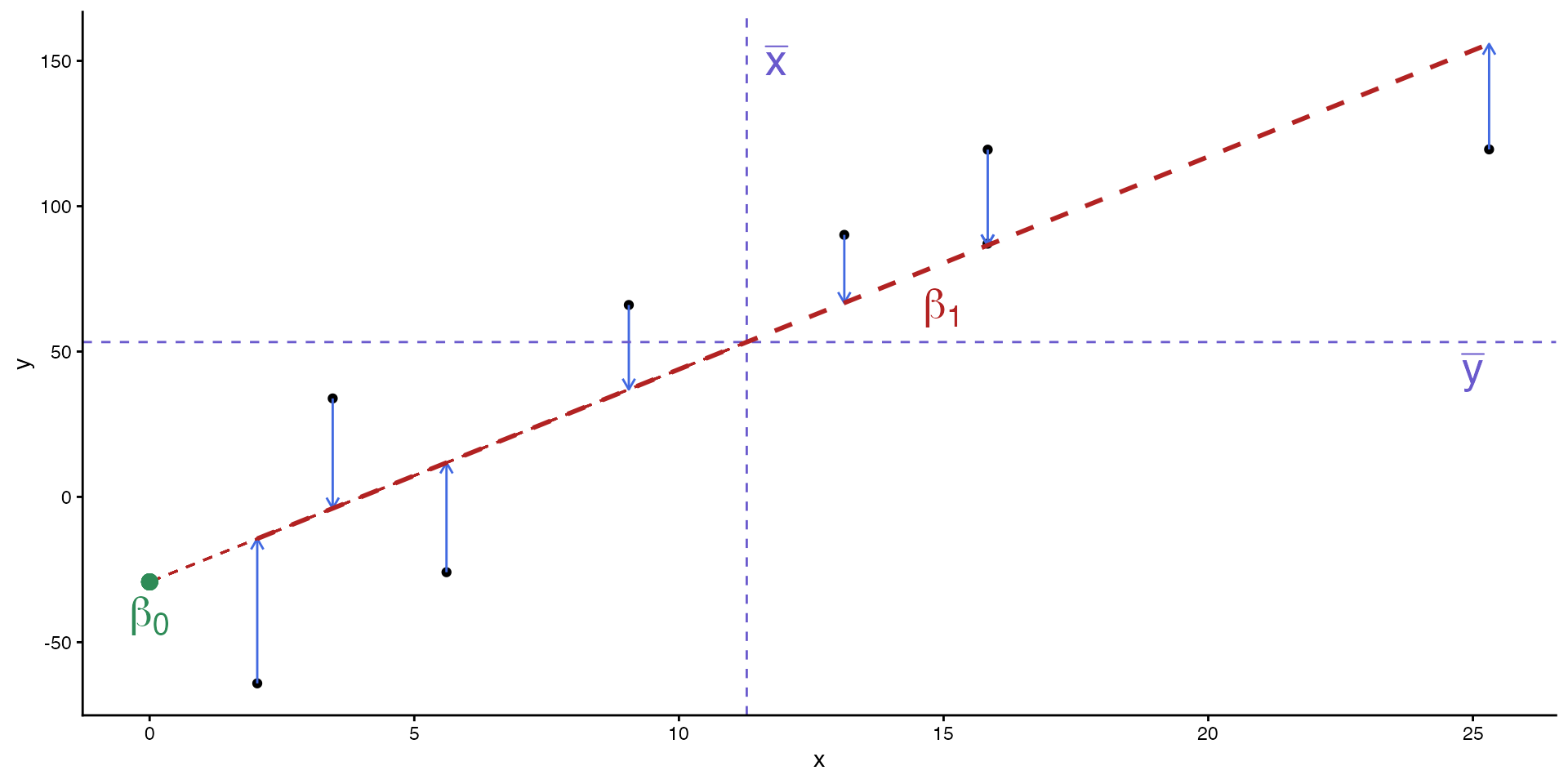 theme_classic()\[ \beta_0 = \bar{y} - \beta_1 \bar{x} \]