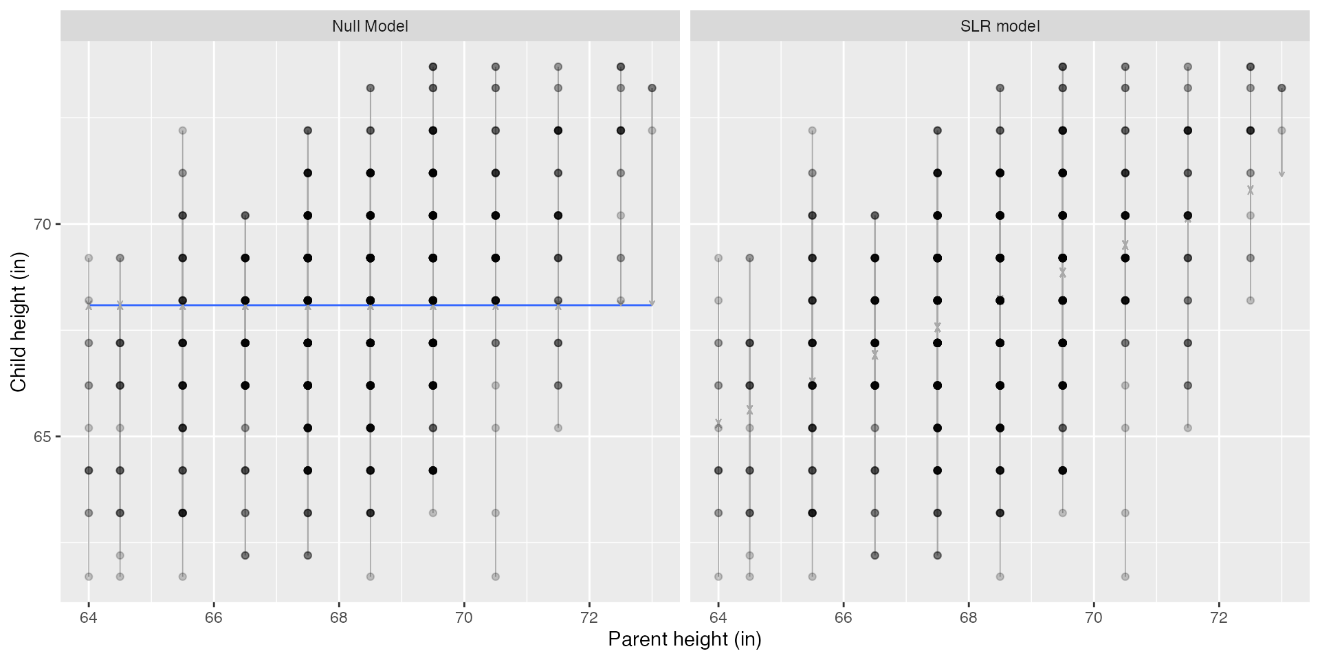mutate(model = rep(c("Null Model", "SLR model"), each = nrow(Galton)))