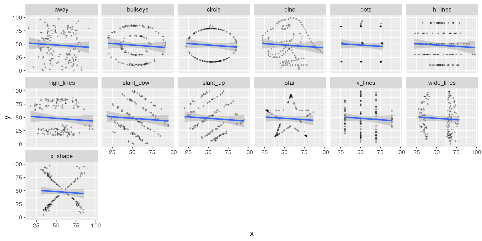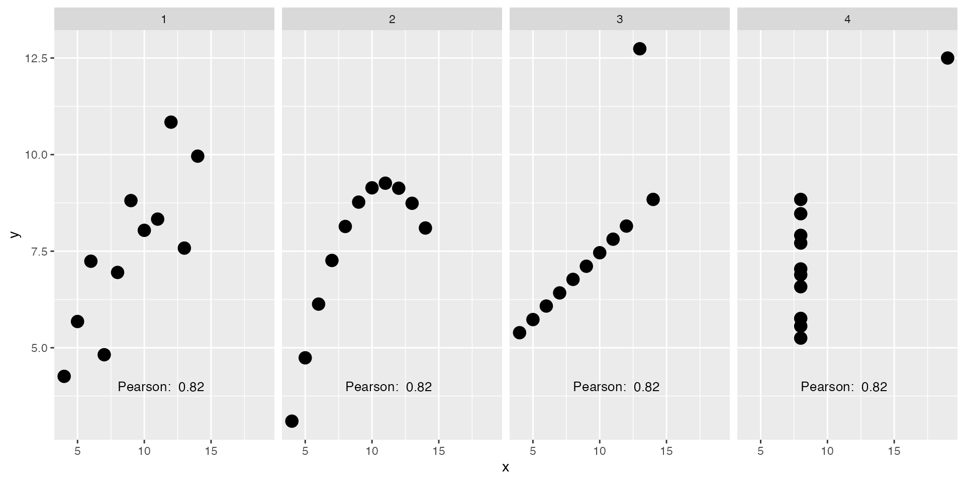 inherit.aes = FALSE, size = 3.5, color = "black", hjust = 0)Correlation coefficients are not reliable in inferring the ‘type’ of relationship between variables – we must visualise.