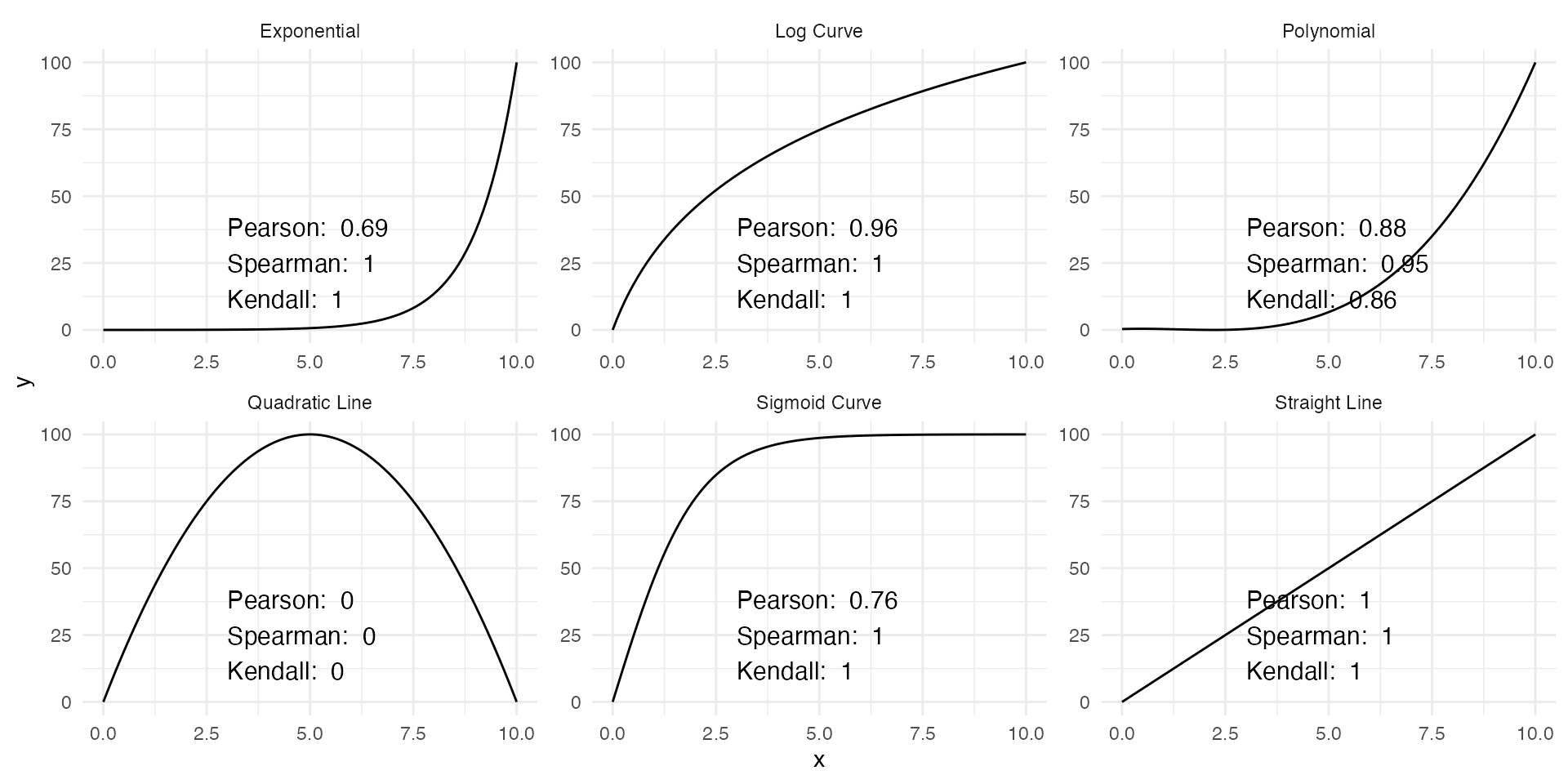 Spearman’s rank and Kendall’s tau are correlation coefficients for all monotonic relationships.