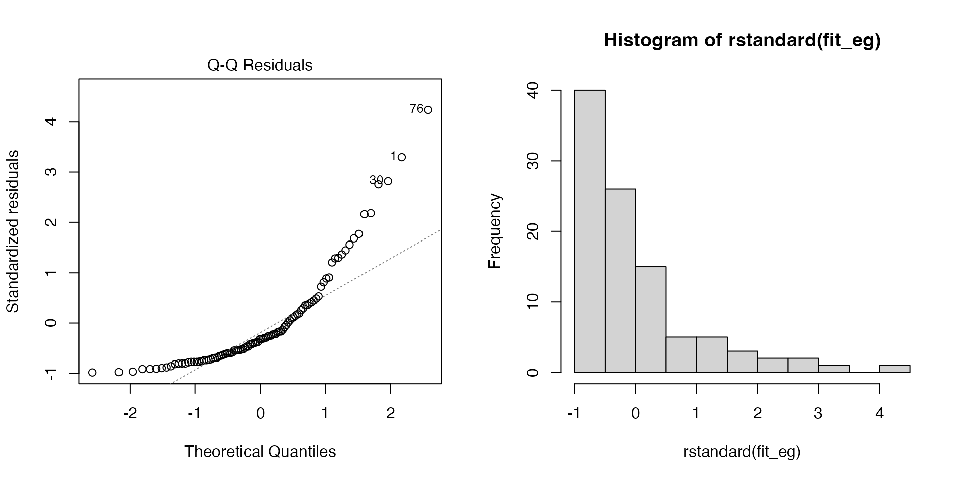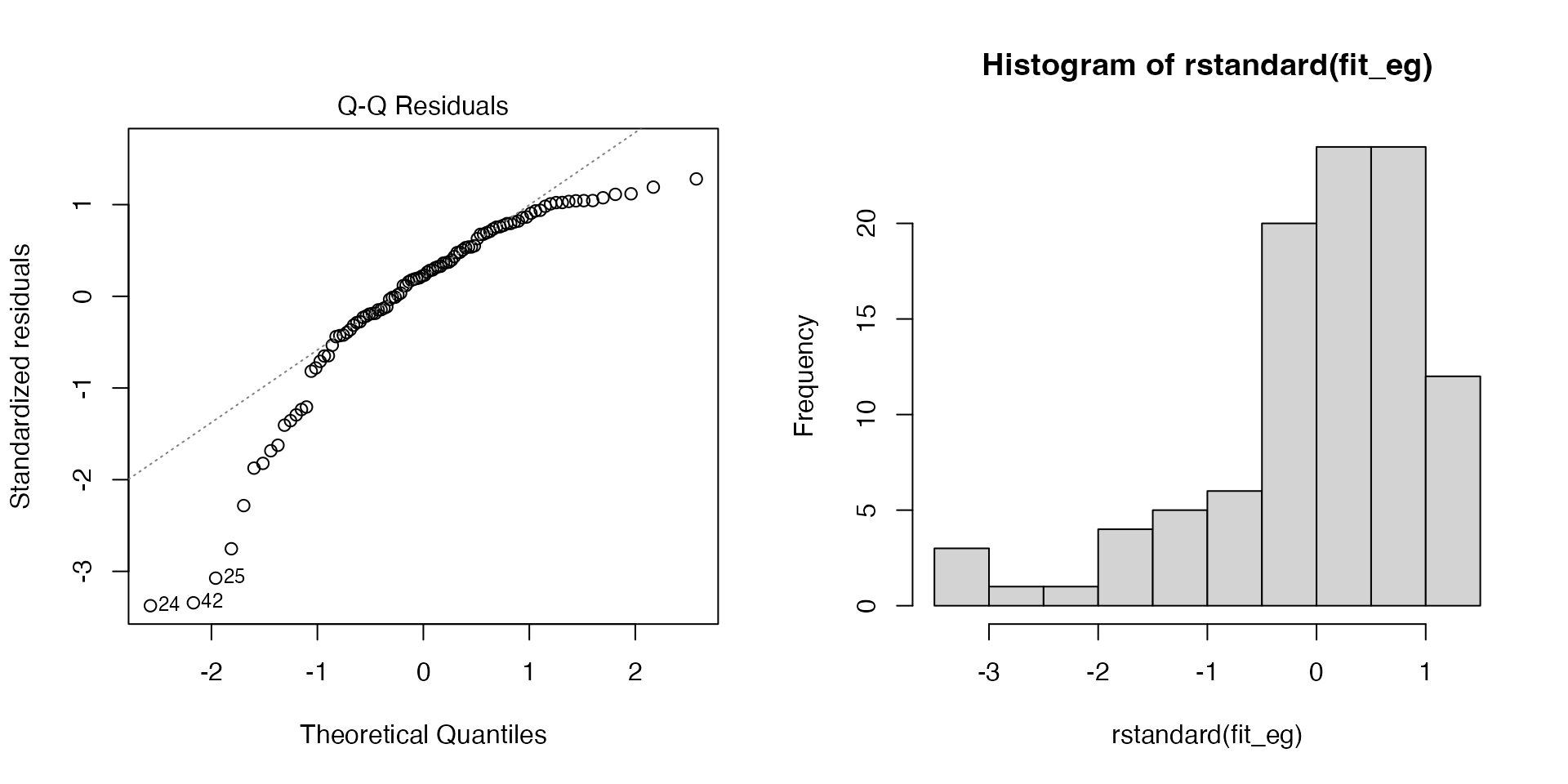If residuals are not normally distributed, try a transformation of the response variable \(y\) first, otherwise transform the predictor variable \(x\). Both can be done at the same time.
