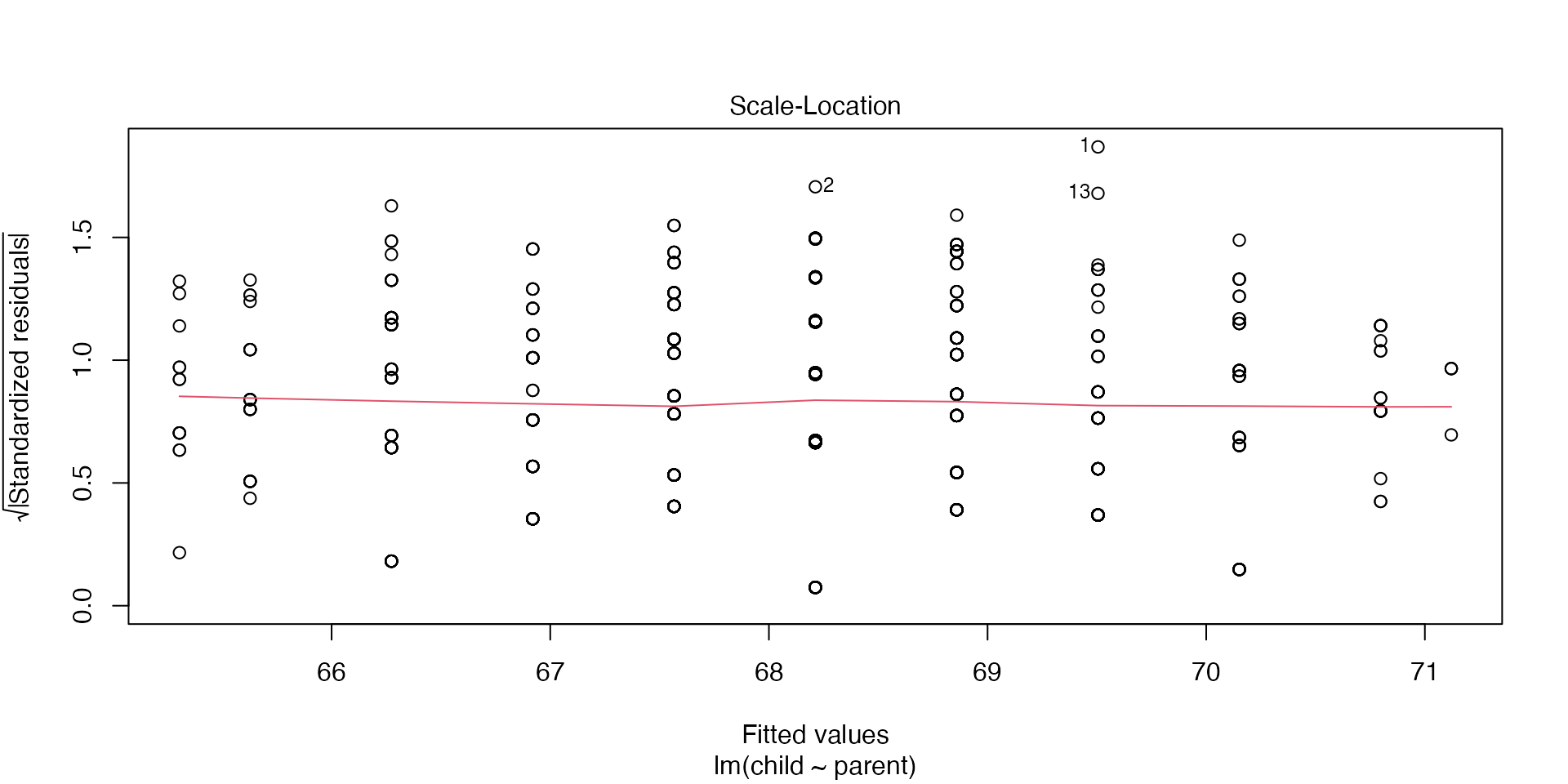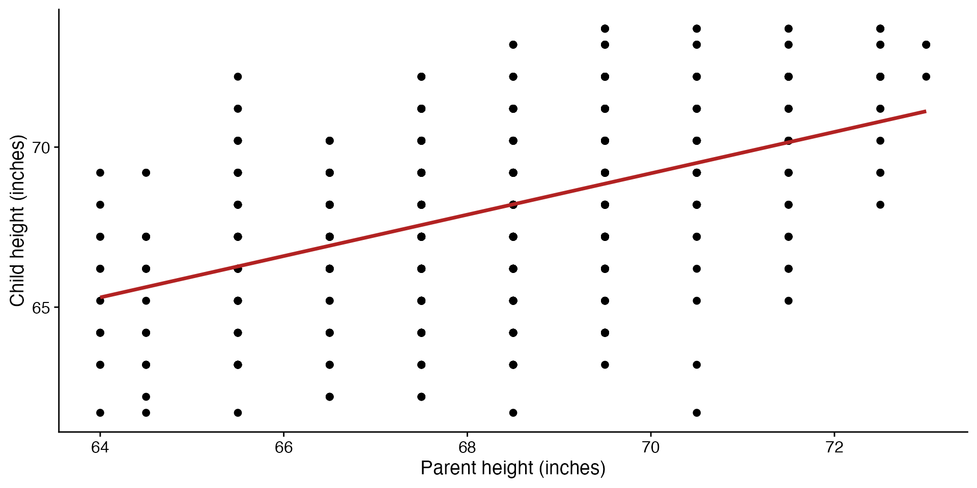 e.g. if a parent is 70 inches, how tall will the child be? \(23.94153 + 0.64629 \cdot 70 = 68.5\) inches (174 cm).