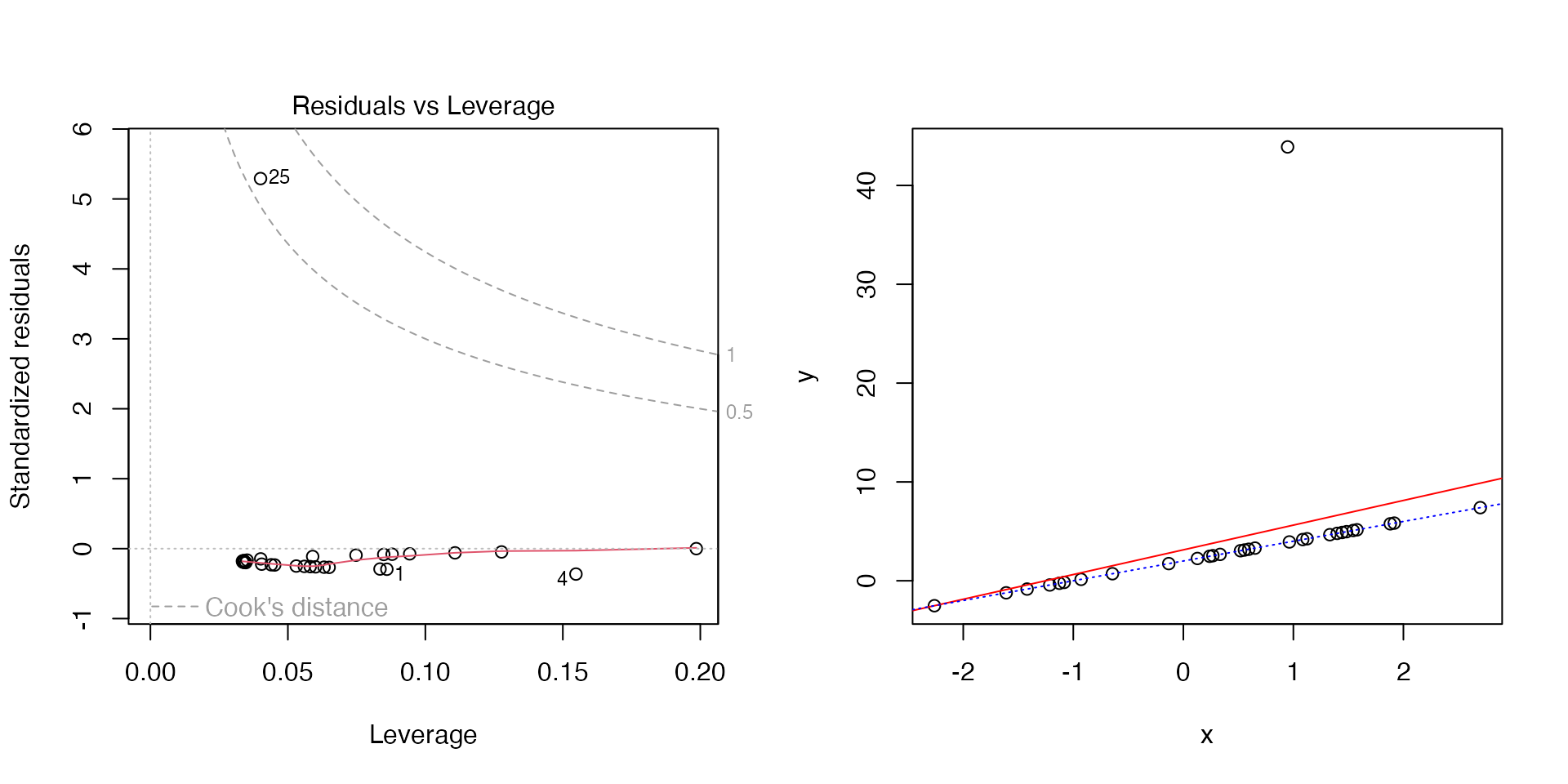 Points that exceed the dashed line (which appears once they approach the Cook’s distance), are likely to influence the model. These outliers should be removed.