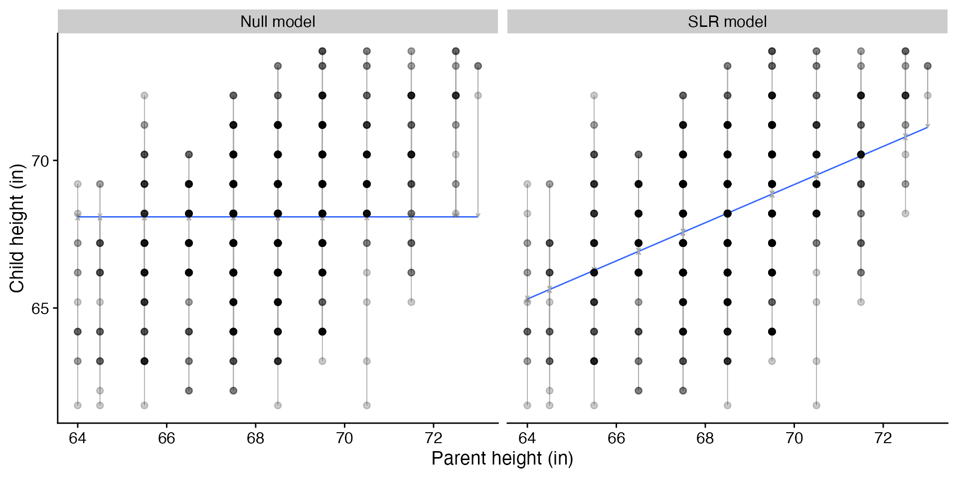 mutate(model = rep(c("Null model", "SLR model"), each = nrow(Galton)))