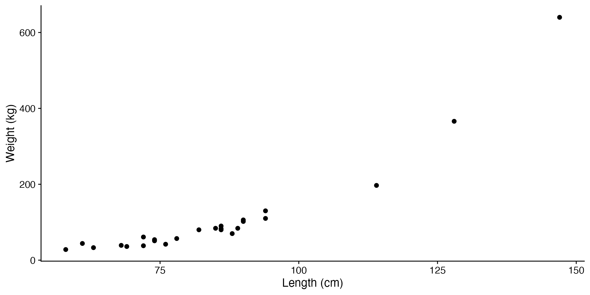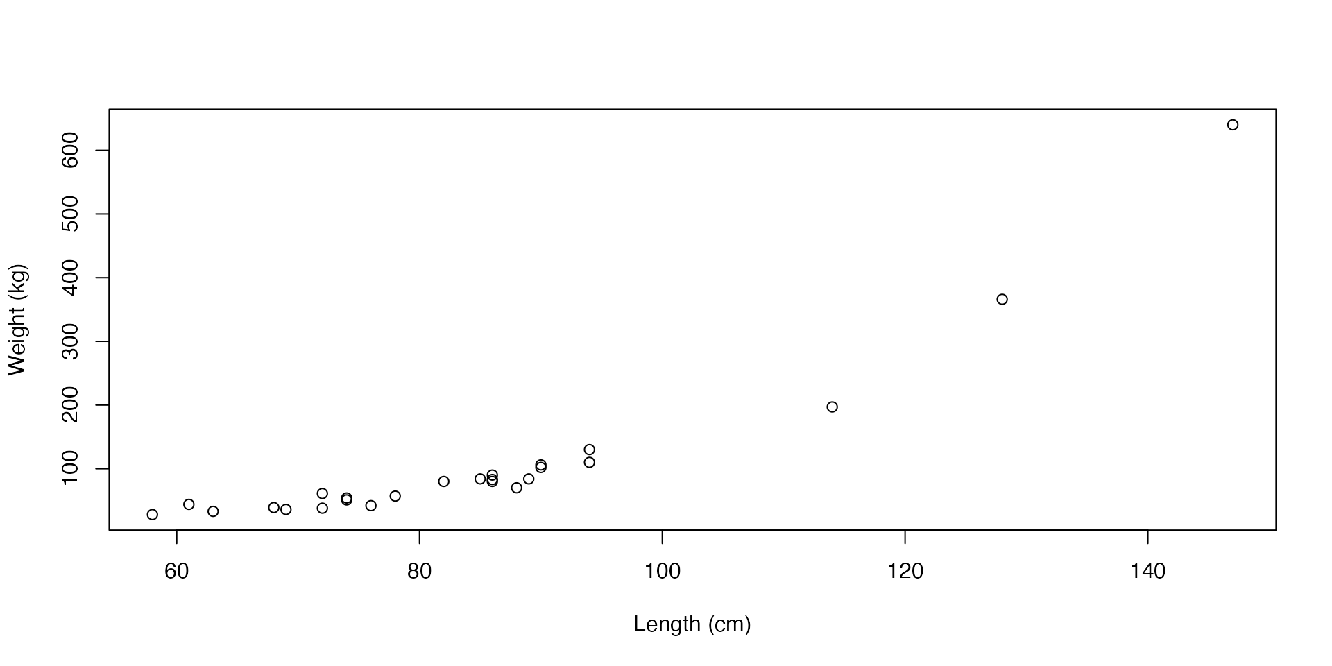 labs(x = "Length (cm)", y = "Weight (kg)", title = "Original") +