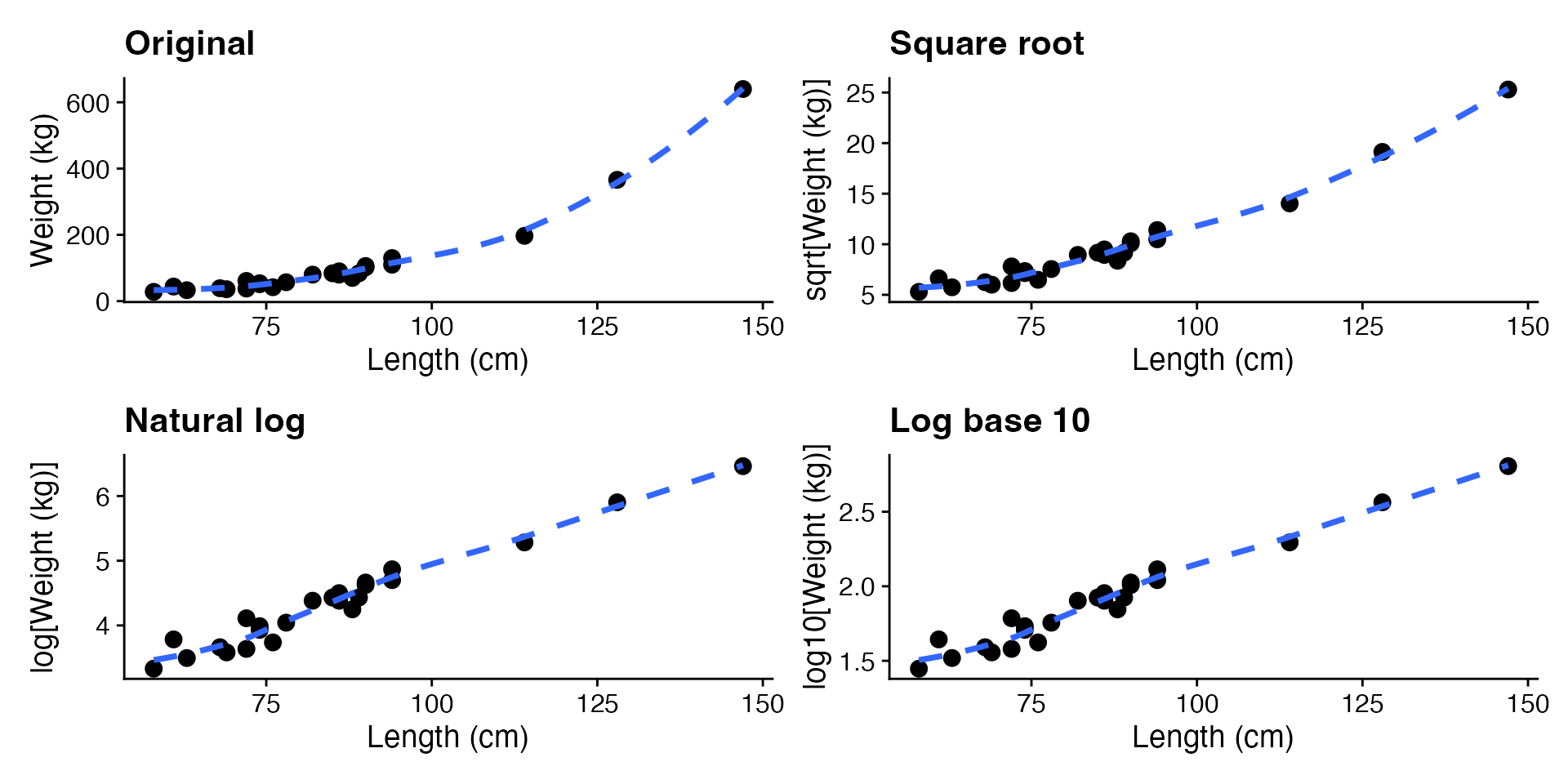 labs(x = "Length (cm)", y = "sqrt[Weight (kg)]", title = "Square root") +