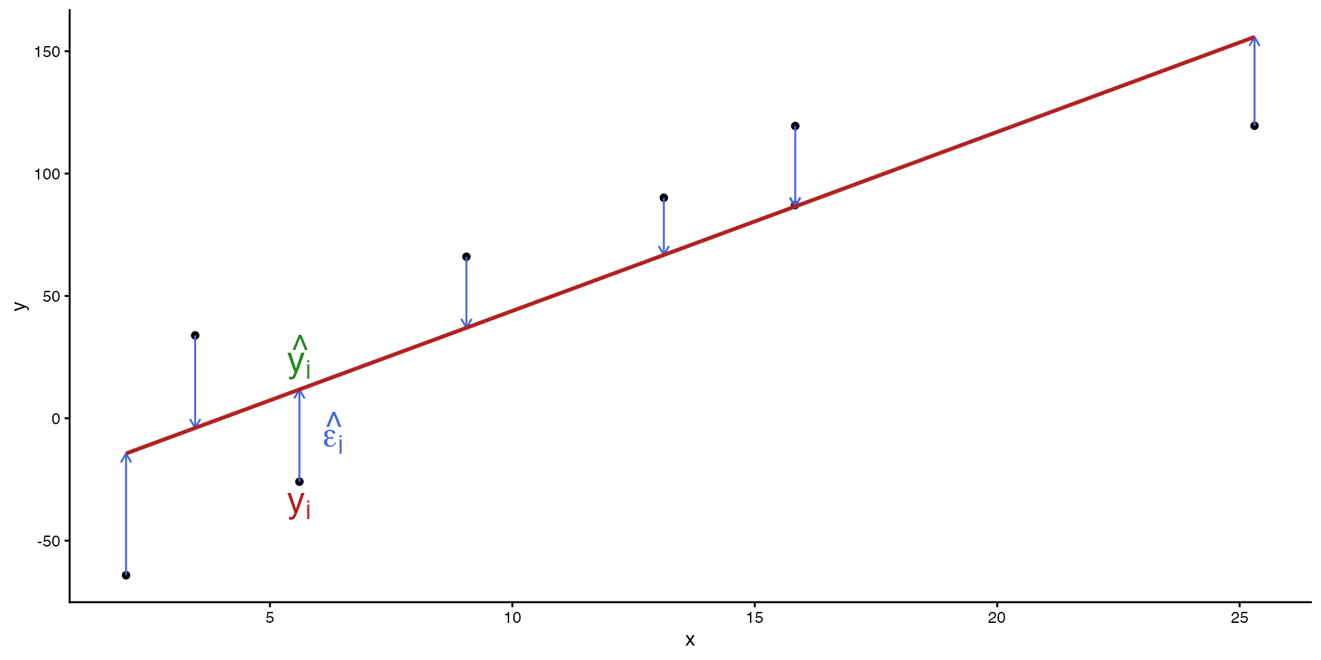 \[ \color{firebrick}{\hat{\epsilon_i}} = \color{royalblue}{y_i} - \color{forestgreen}{\hat{y_i}} \]