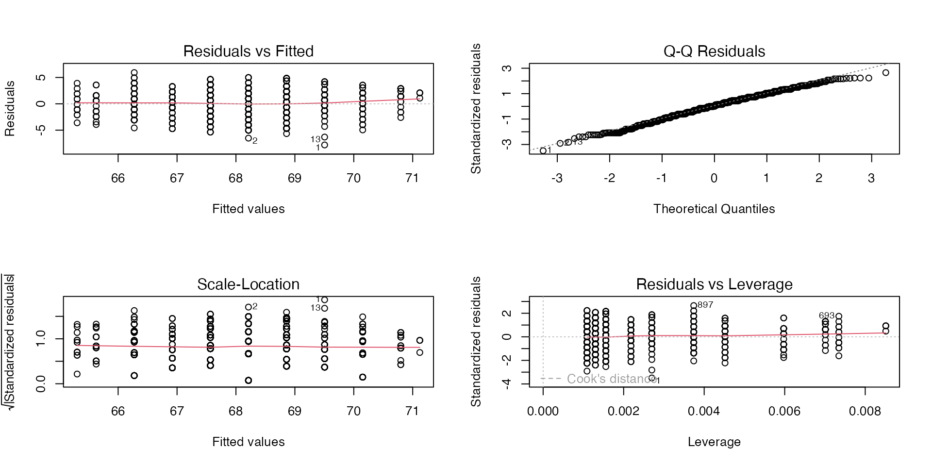 We fitted a linear model to predict child height from parent height, and model assumptions were met. The model was statistically significant (R2 = 0.21, F(1, 926) = 246.84, p < .001), hence the null hypothesis was rejected in favour of the linear model. The effect of parent height is statistically significant and positive (\(\beta\) = 0.65, t(926) = 15.71, p < .001).