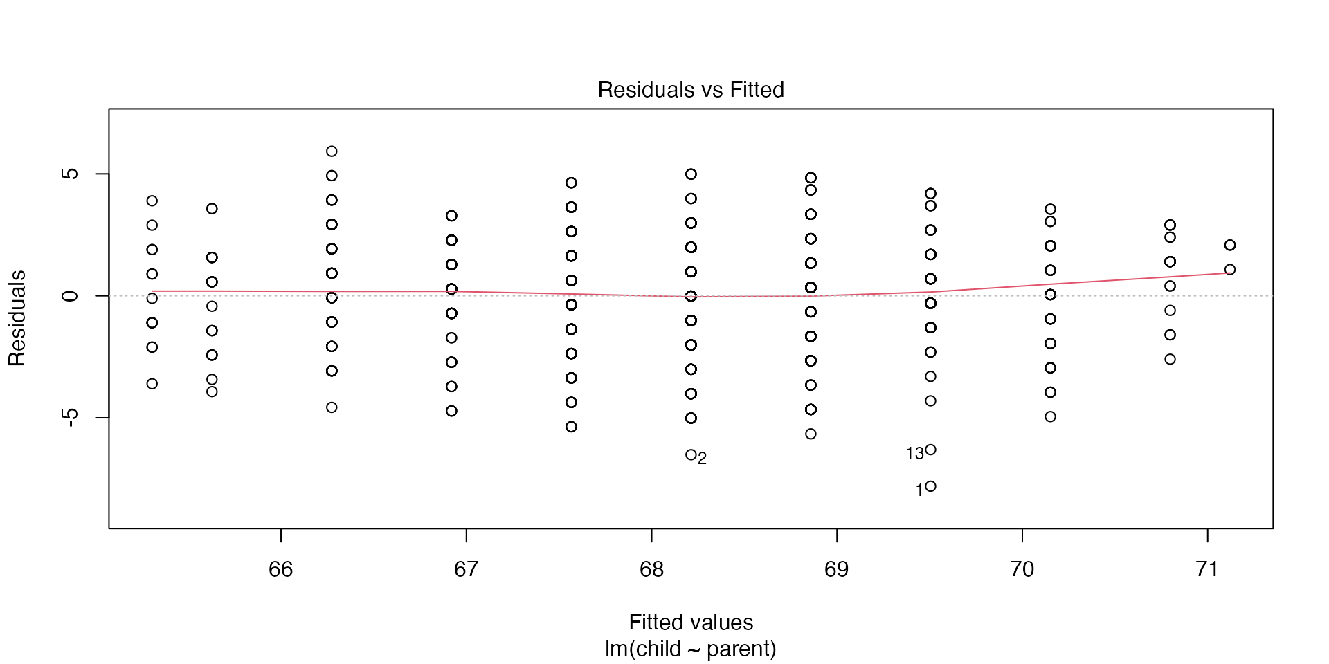 F-statistic: 246.8 on 1 and 926 DF, p-value: < 2.2e-16We can also use the Estimate values to write the equation of the regression line: \[ \widehat{child} = 23.94153 + 0.64629 \cdot parent\]