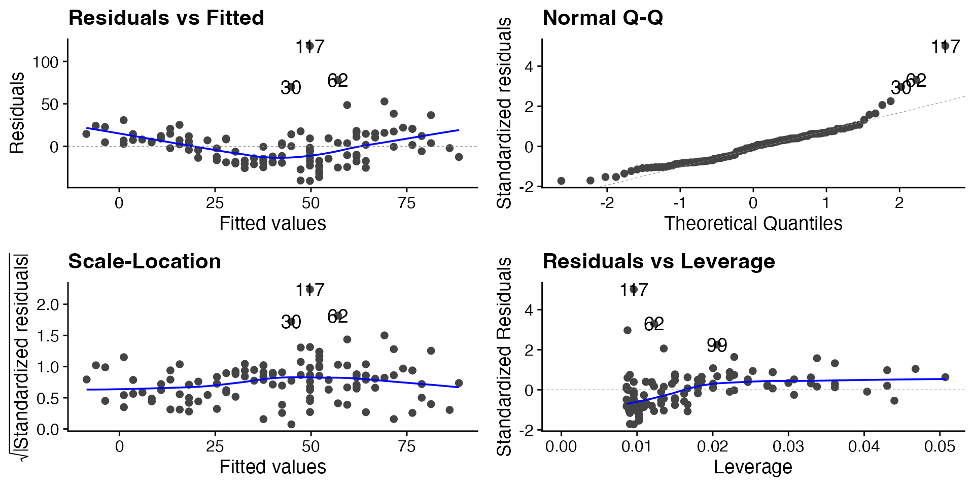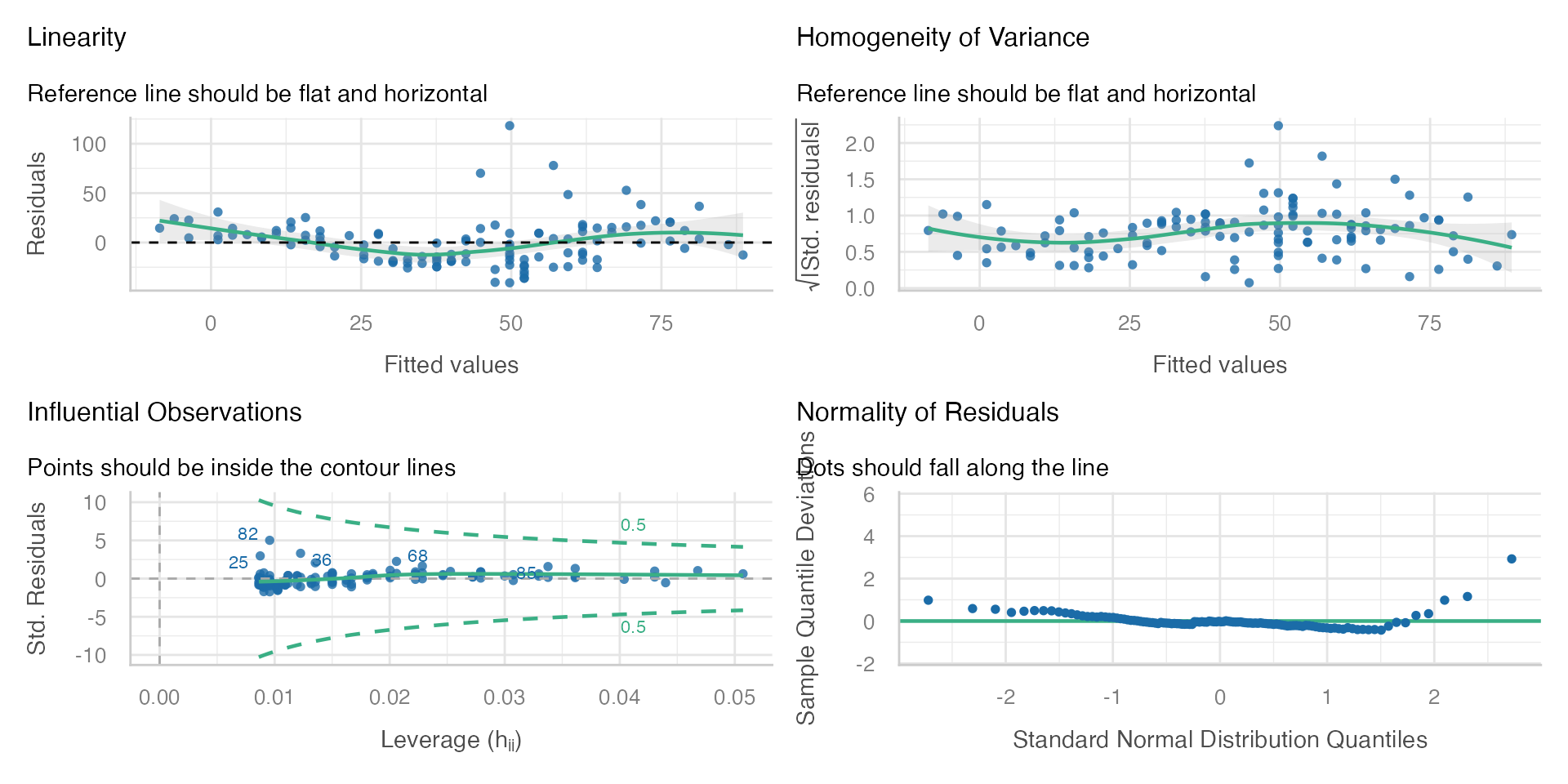 log()Some evidence of non-linearity in the diagnostic plots. Transform and re-check assumptions.