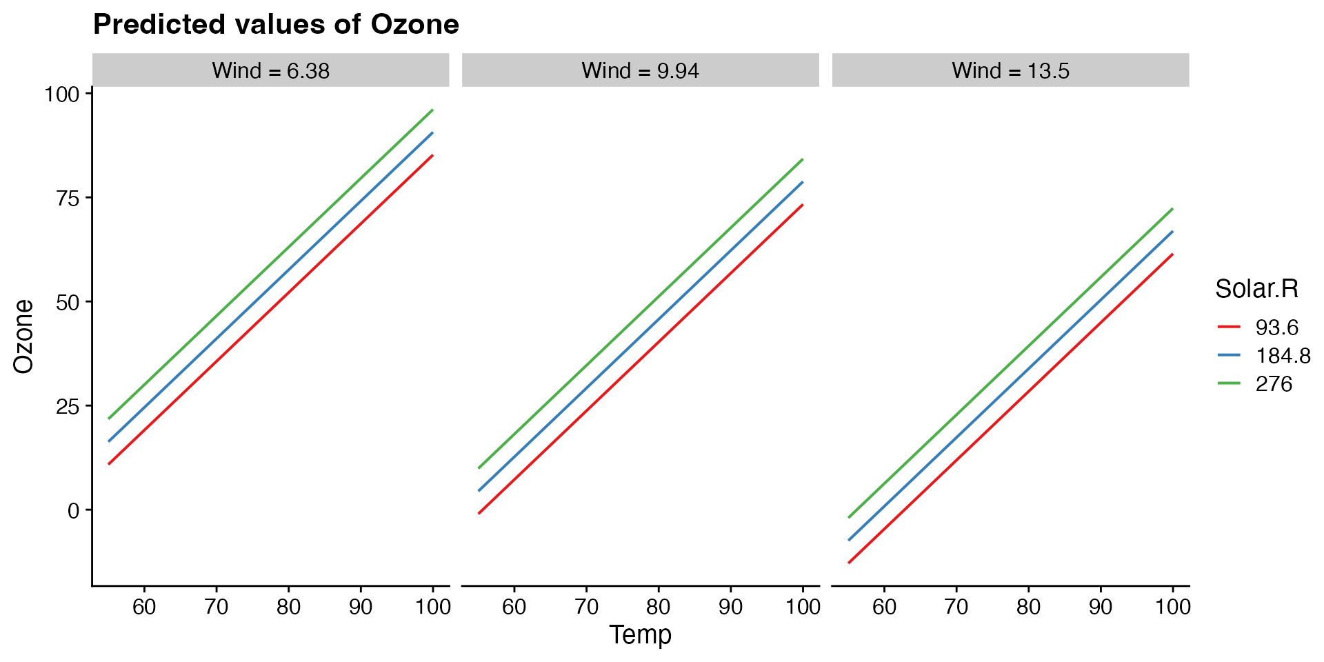 Solar.R, Ozone increases by a mean value of 0.06 ppb.Temp, Ozone increases by a mean value of 1.65 ppb.Wind, Ozone decreases by a mean value of 3.33 ppb.Caution
