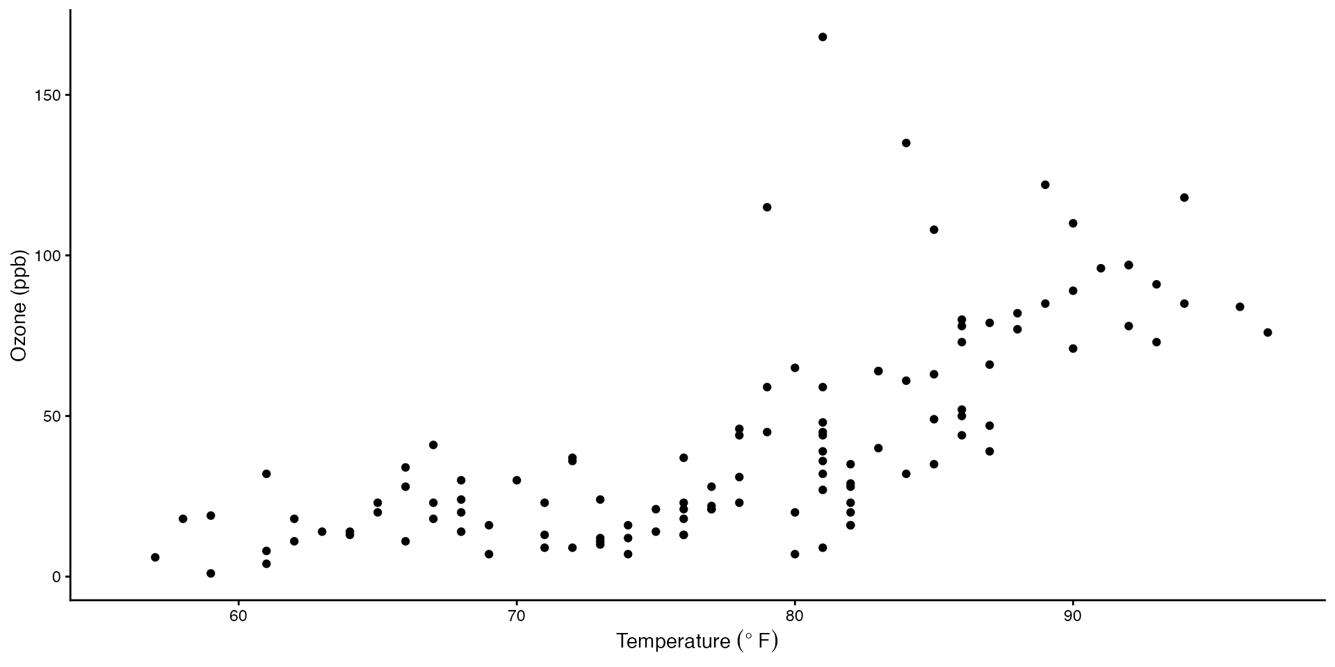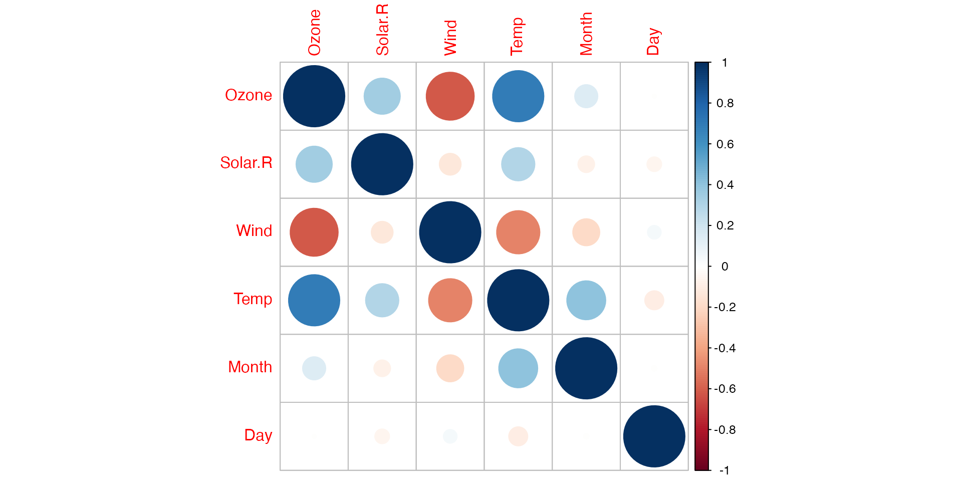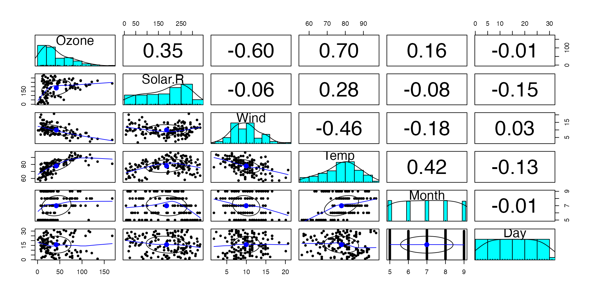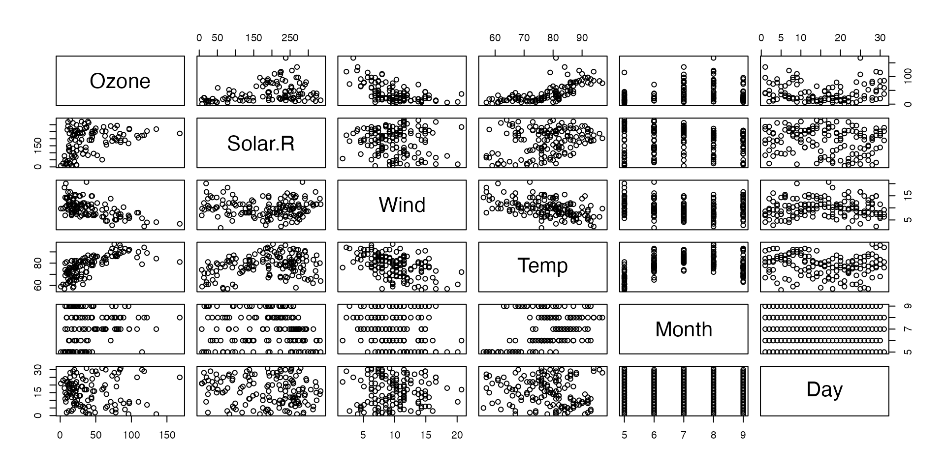 corrplotpsychOzone?Temp (\(r\) = 0.70), Wind (\(r\) = -0.60) and Solar.R (\(r\) = 0.35) are the most correlated with Ozone.