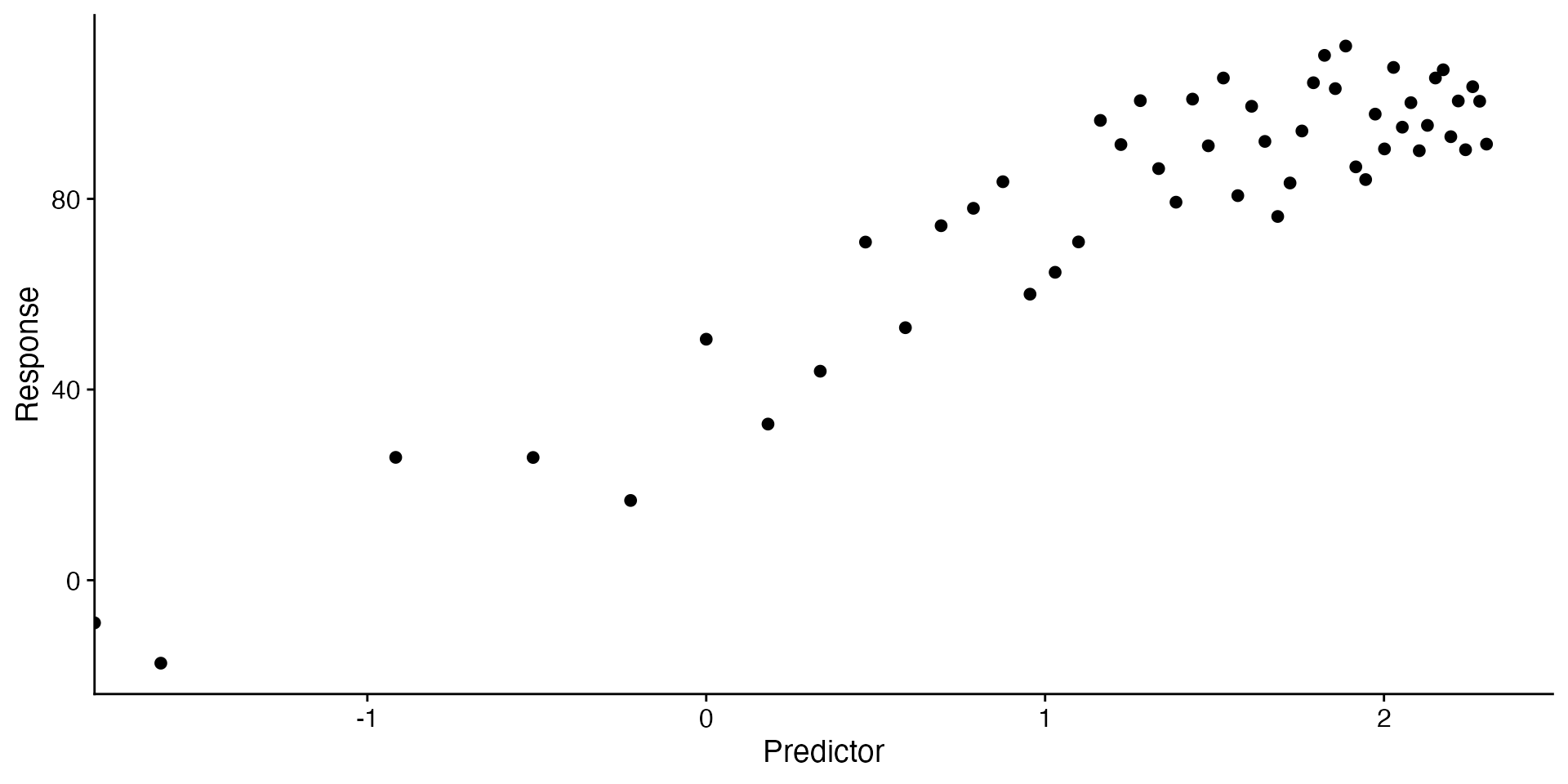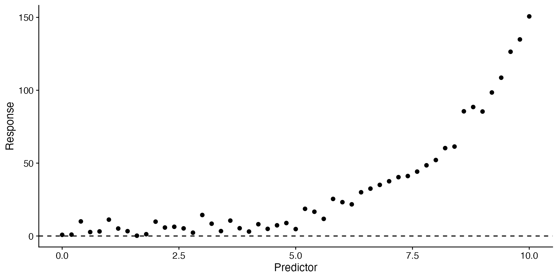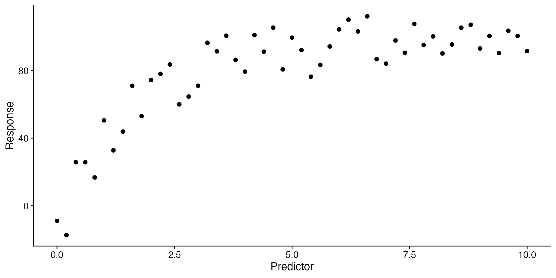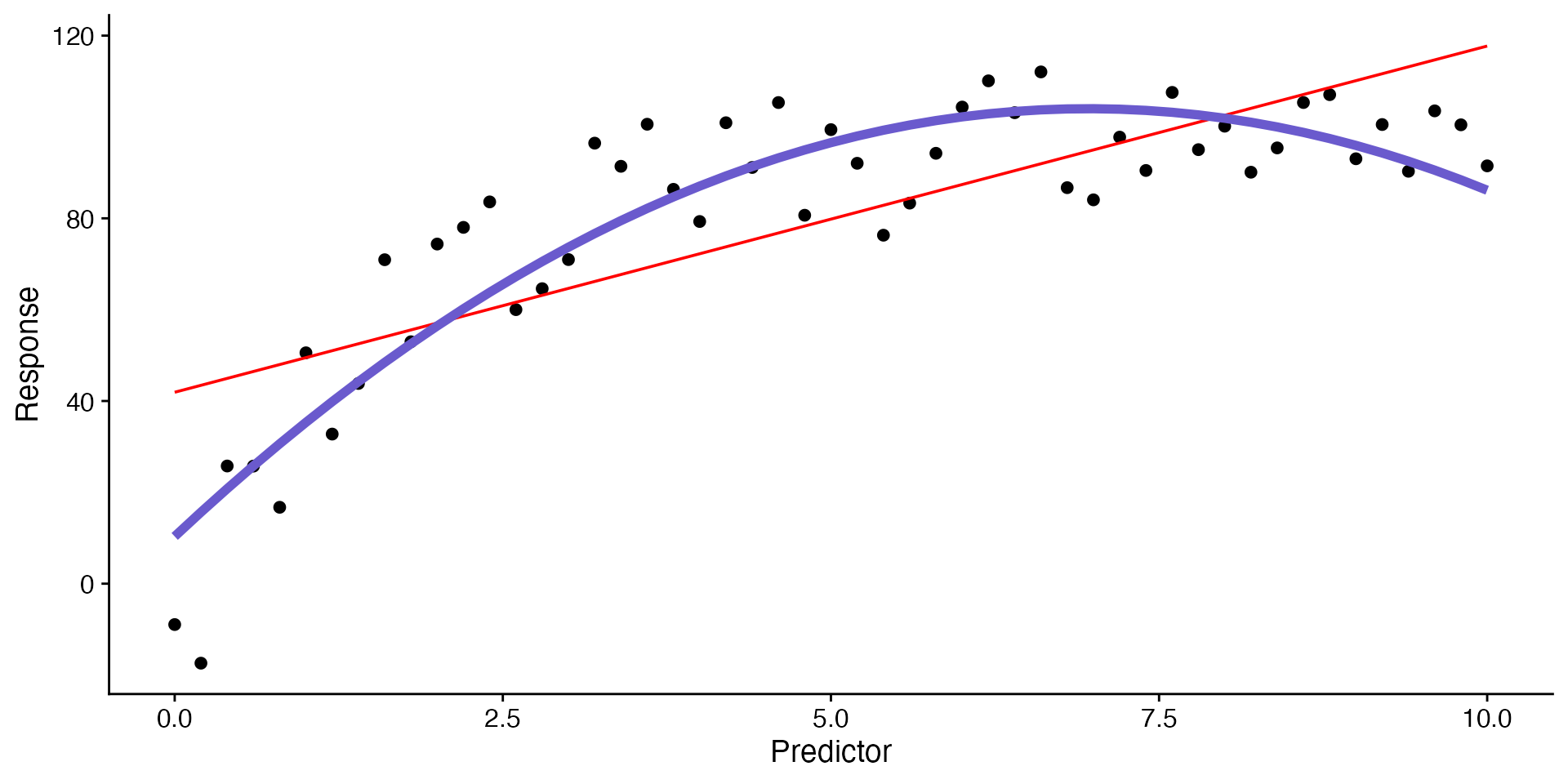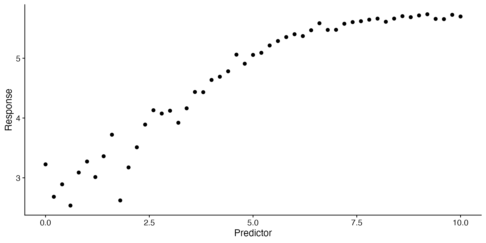 ggplot(data = curvilinear, aes(x = predictor, y = response)) +