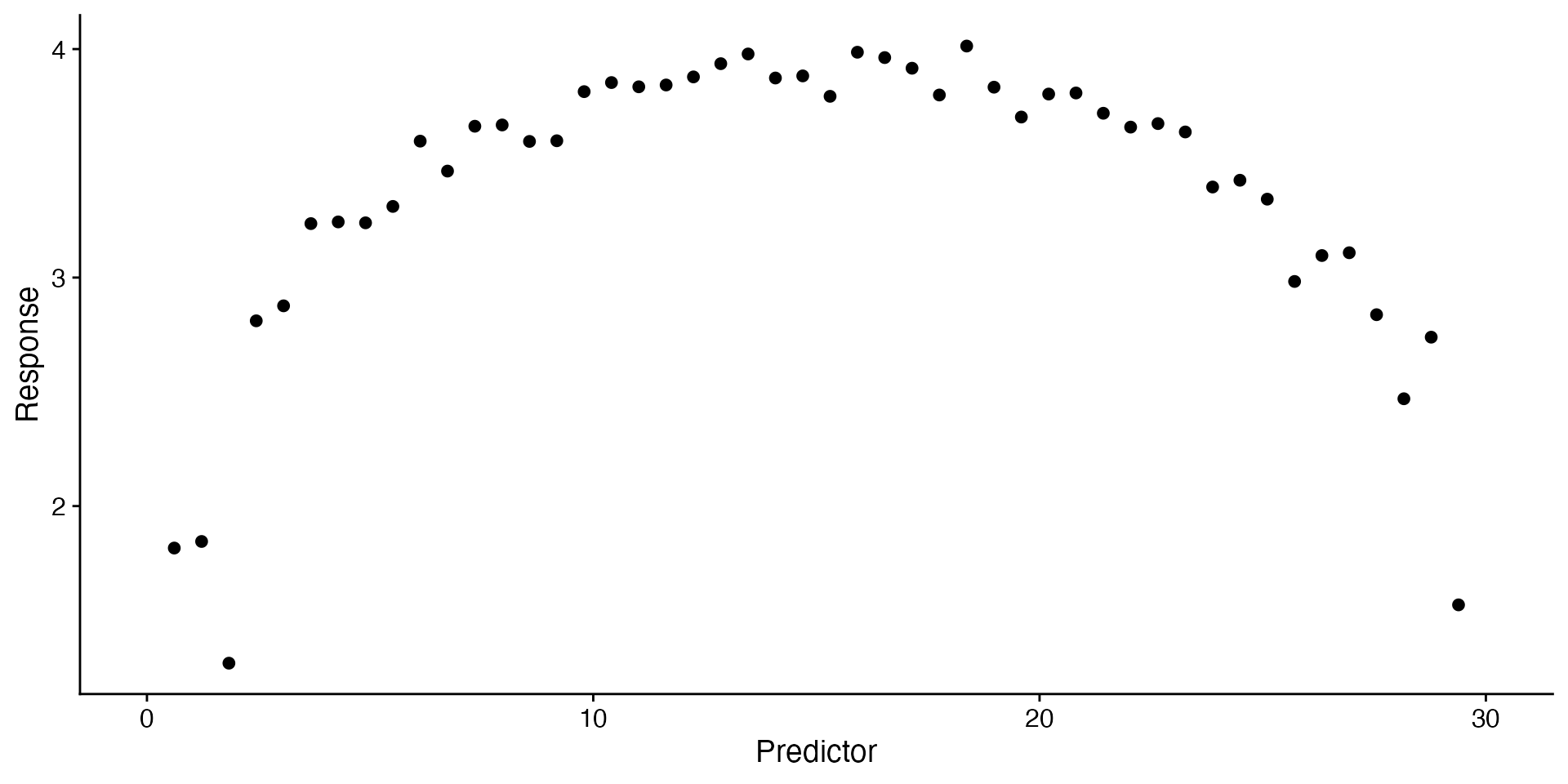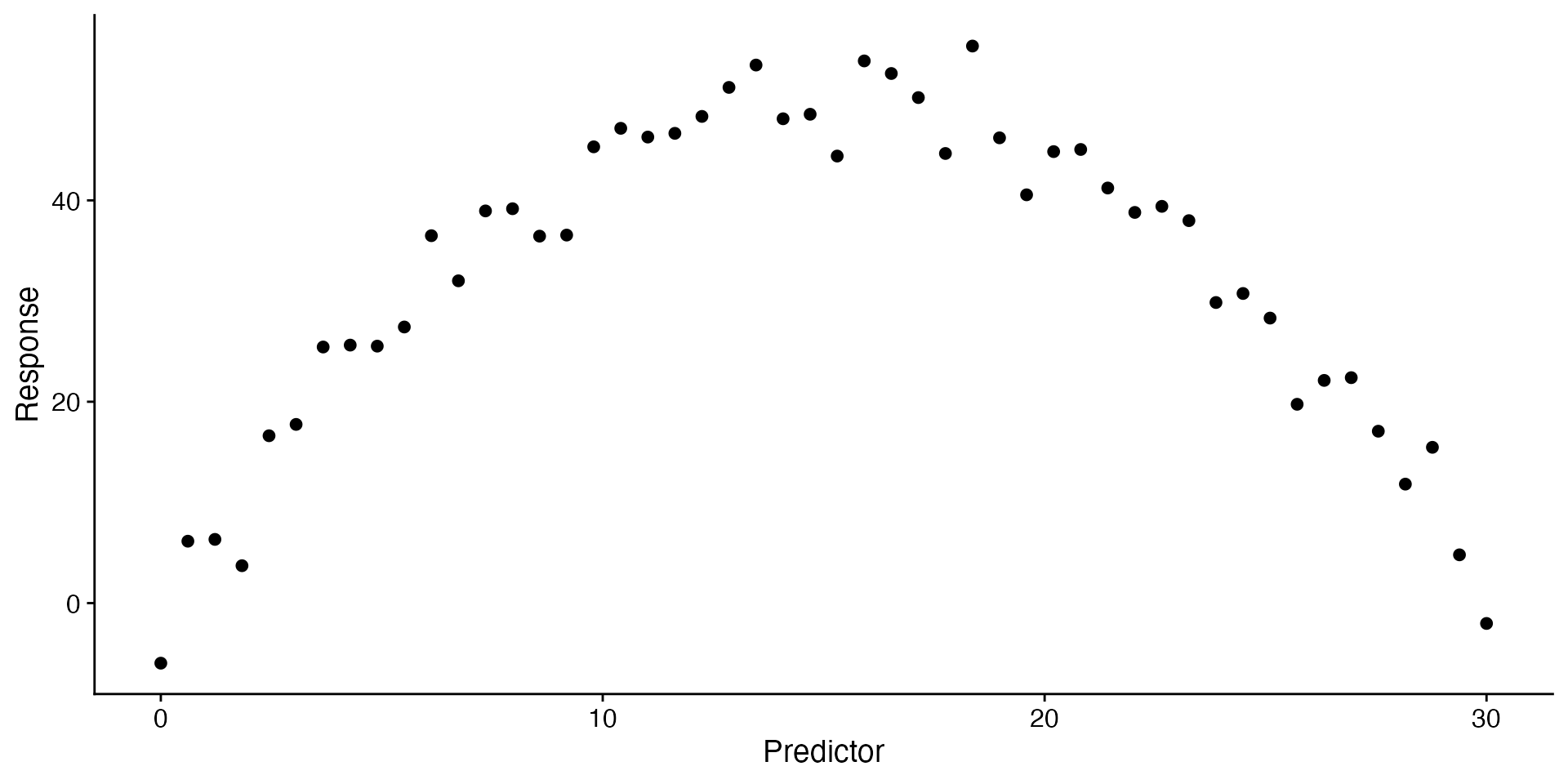 curvilinear <- tibble(predictor = seq(0, 30, length.out = 50),