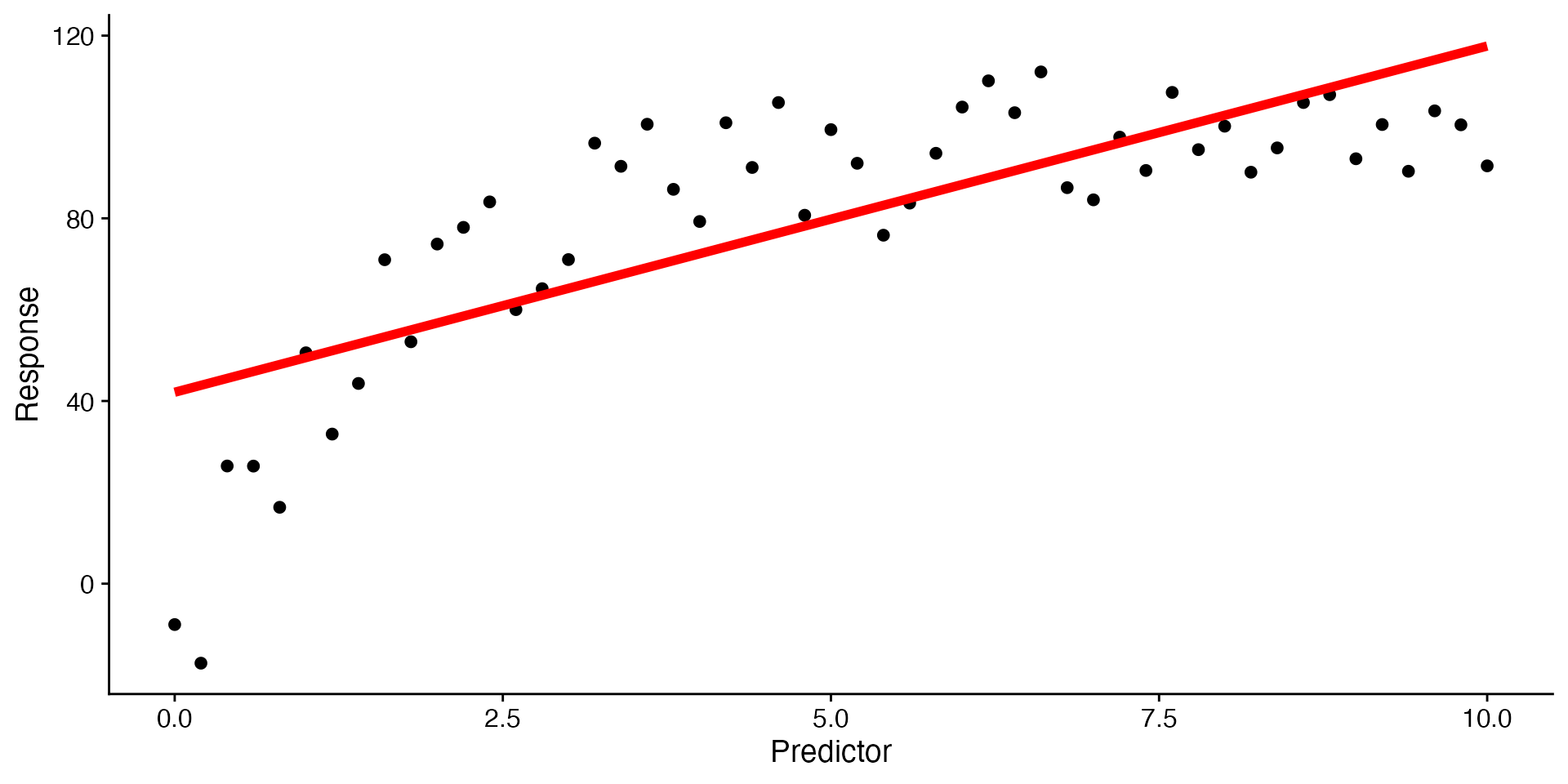 labs(x = "Predictor", y = "Response")Examples: food intake, drug dosage, exercise.