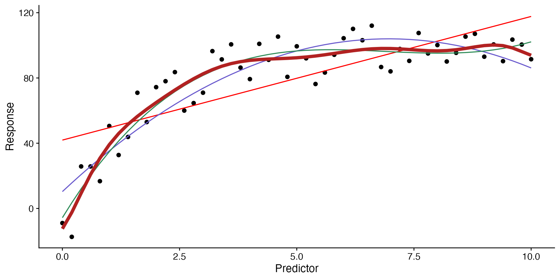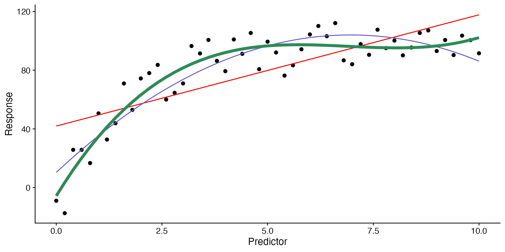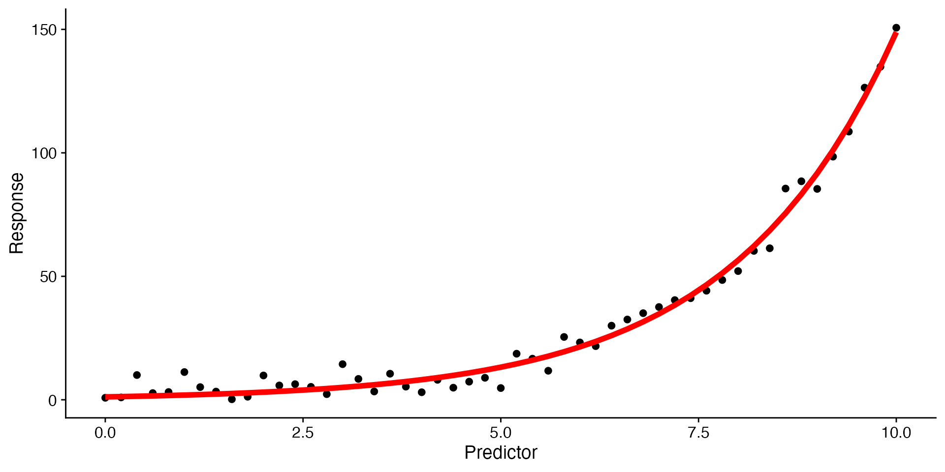 labs(x = "Predictor", y = "Response")Examples: growth of bacteria, disease spread, species growth.
