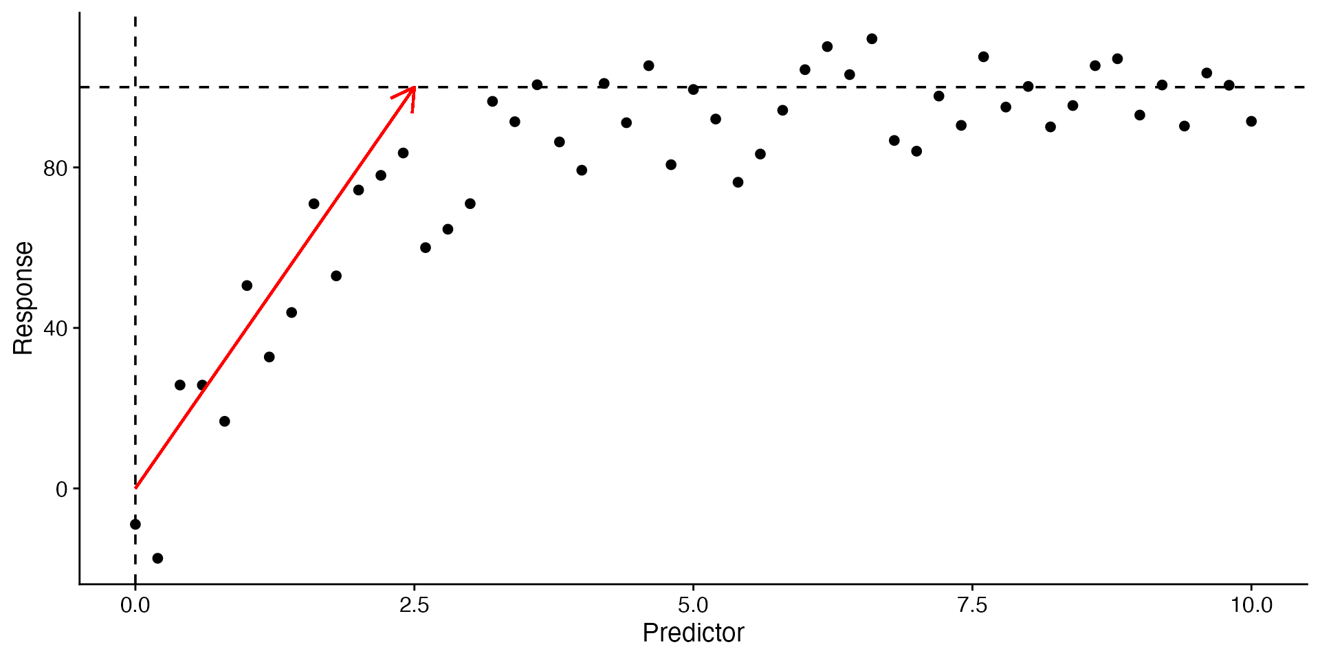 geom_point(data = asymptotic, aes(x = predictor, y = response), inherit.aes = FALSE) +