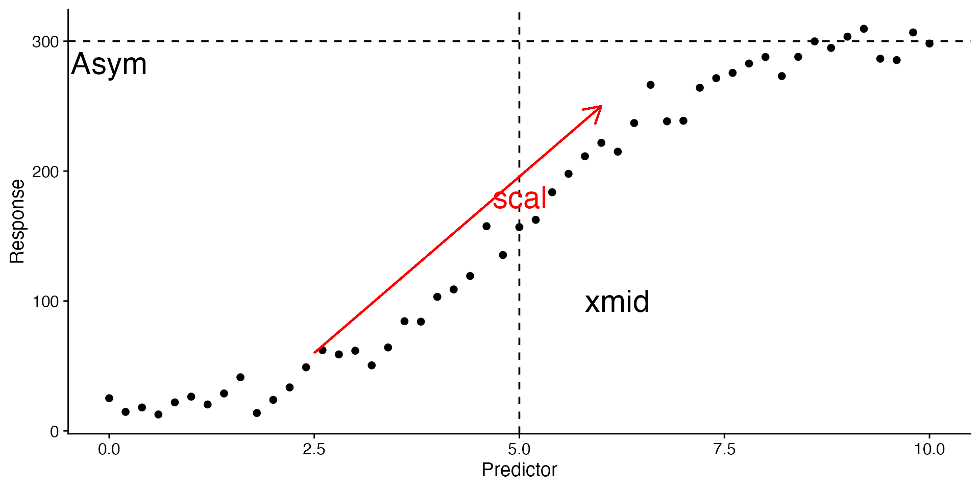 annotate("text", x = 4, y = 180, label = "scal", size = 8, colour = "red", hjust = -1)Some starting values would be \(Asym = 300\), \(xmid = 5\), \(scal = 1\).