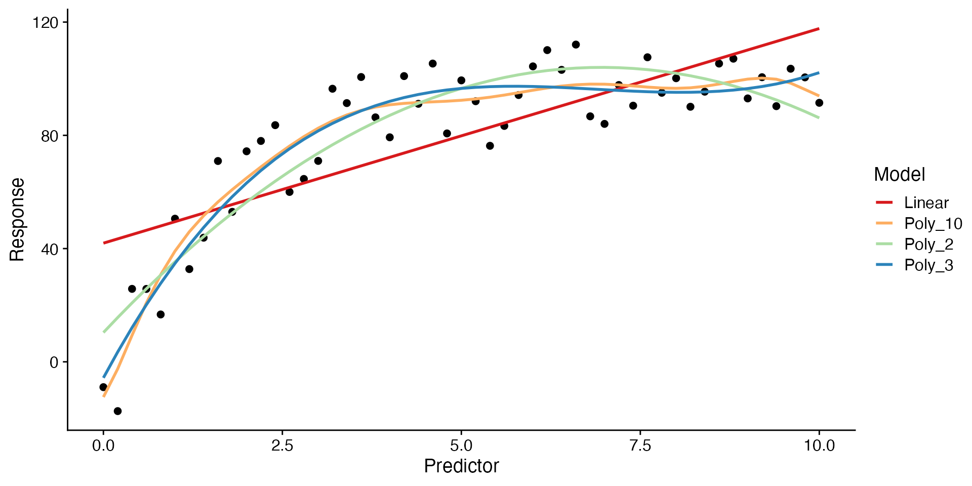 poly(degree = 10))\[ Y_i = \beta_0 + \beta_1 x_i + \beta_2 x_i^2 + ... + \beta_10 x_i^{10} + \epsilon_i \]