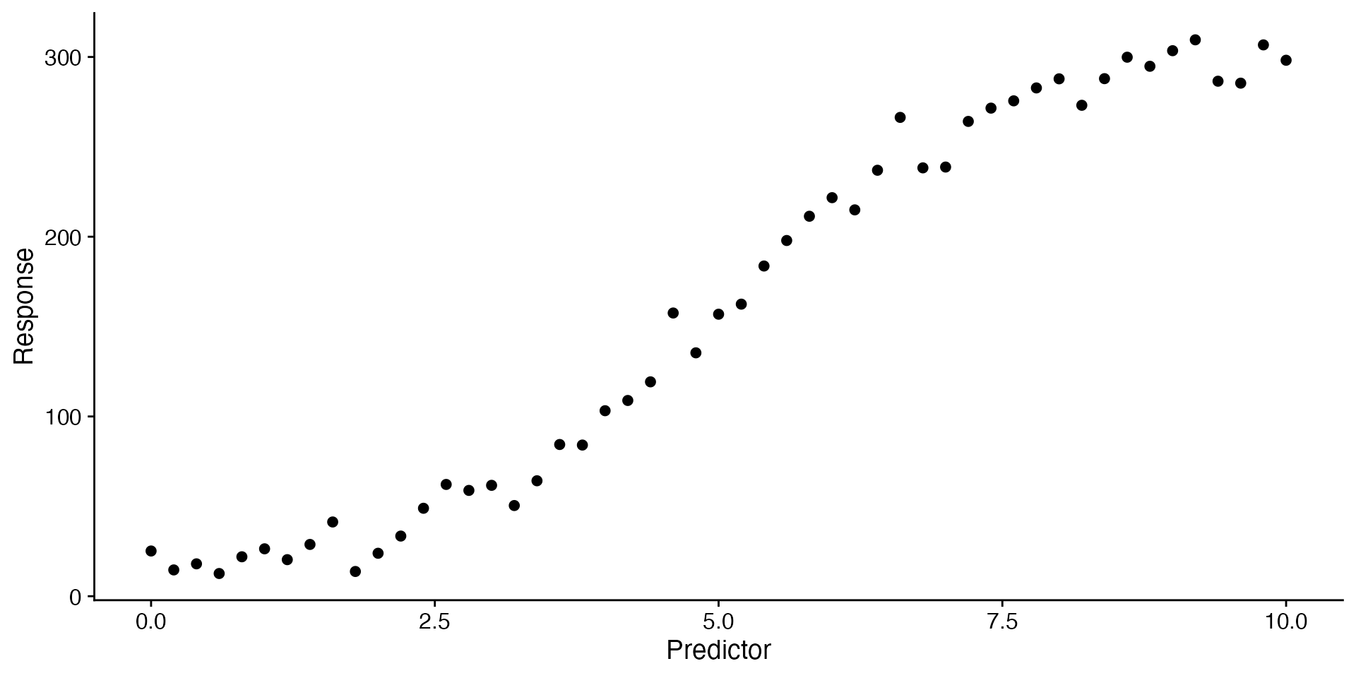 response = 10 + abs(300 * (1 / (1 + exp(-0.8 * (predictor - 5)))) + rnorm(length(predictor), mean = 0, sd = 10)))