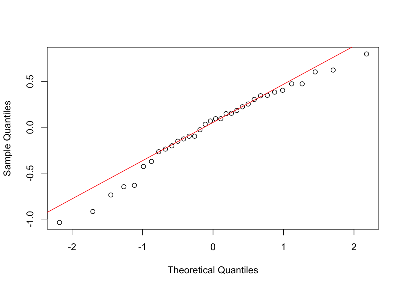 The QQ plot shows points falling roughly along the line, and the Shapiro-Wilk test is not significant (P > 0.05), so normality is reasonable. We already checked the SD ratio in Section 1 and found it was below 2, supporting equal variances.