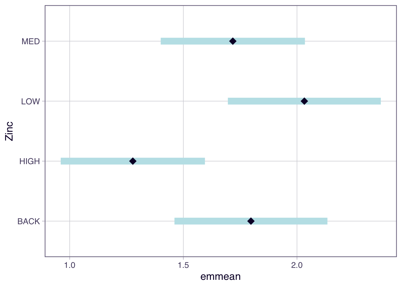 Use the emmeans package to compute estimated marginal means and their confidence intervals for each zinc level. Then visualise the results with plot().