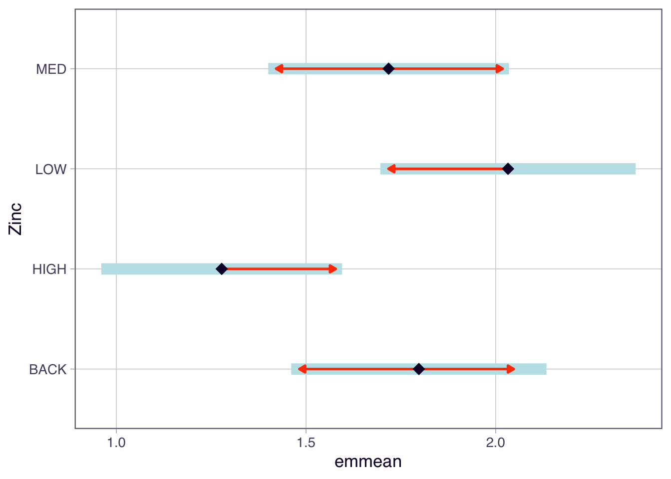 In the plot function above, we have specified comparisons = TRUE. The blue bars are confidence intervals for the EMMs, and the red arrows are for the comparisons among them. If an arrow from one mean overlaps an arrow from another group, the difference is not significant.