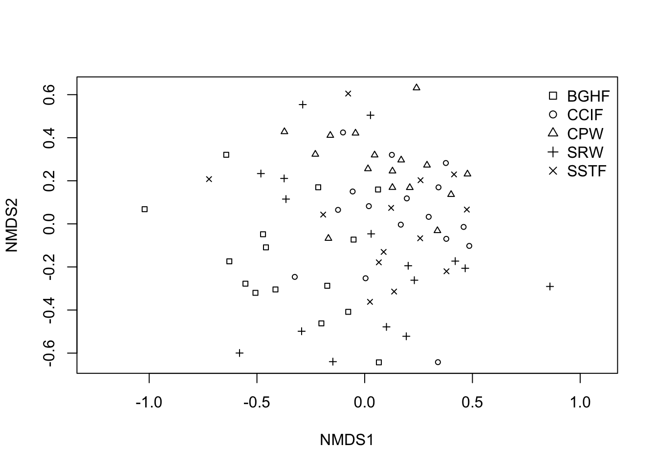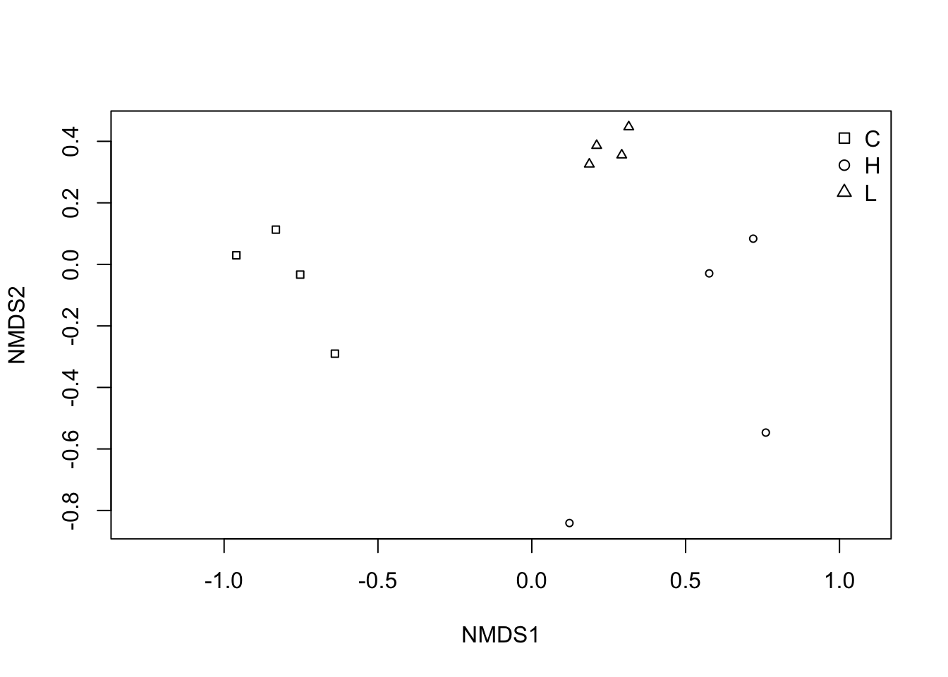 Now let’s look at the nMDS with labels for Community and take a note of the stress value (how well the ordination represents the data). A great stress value is <0.1, an OK stress value is between 0.1 and 0.2, and >0.2 is not so good. A stress greater than 0.3 is essentially arbitrary.
