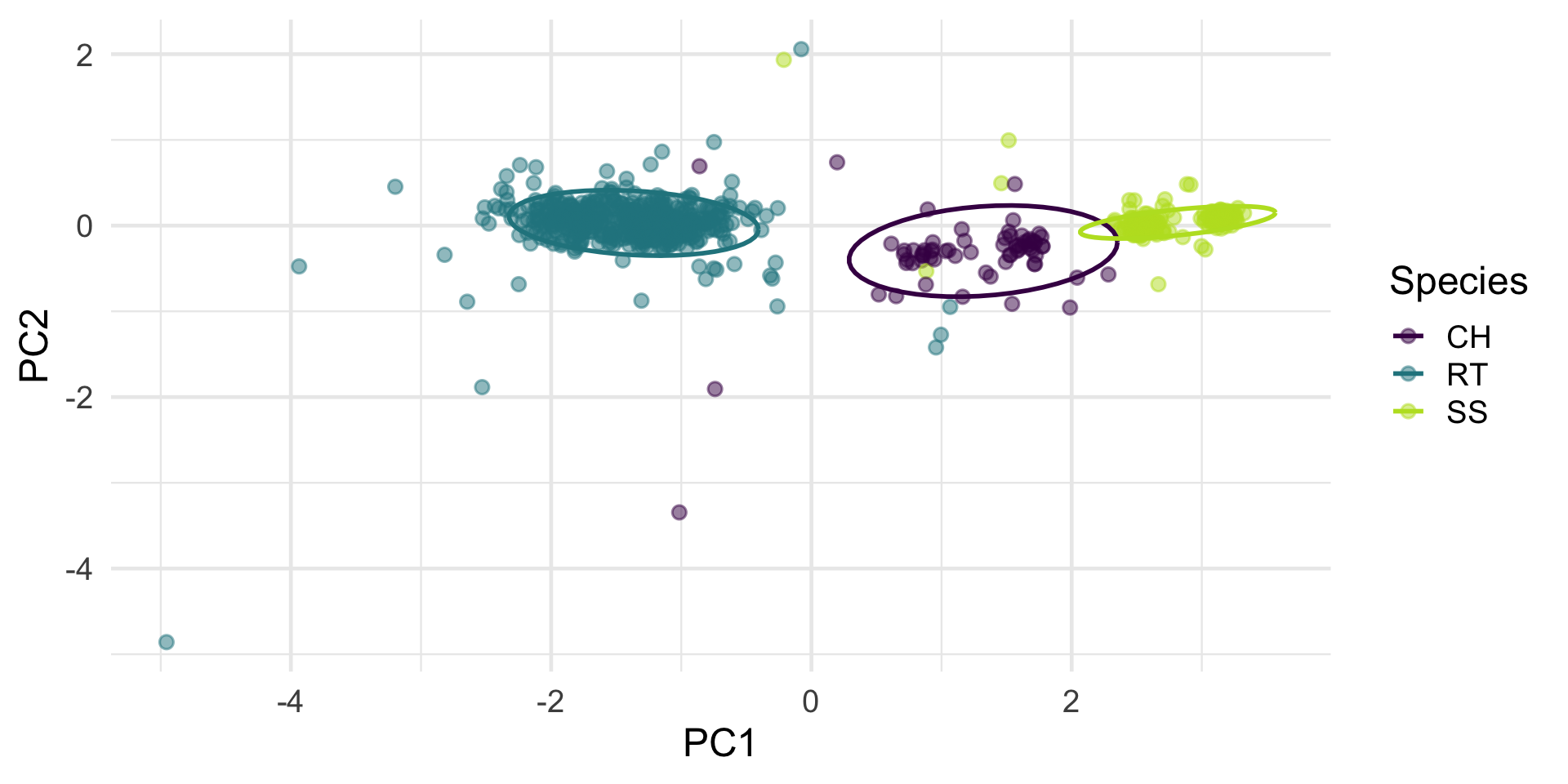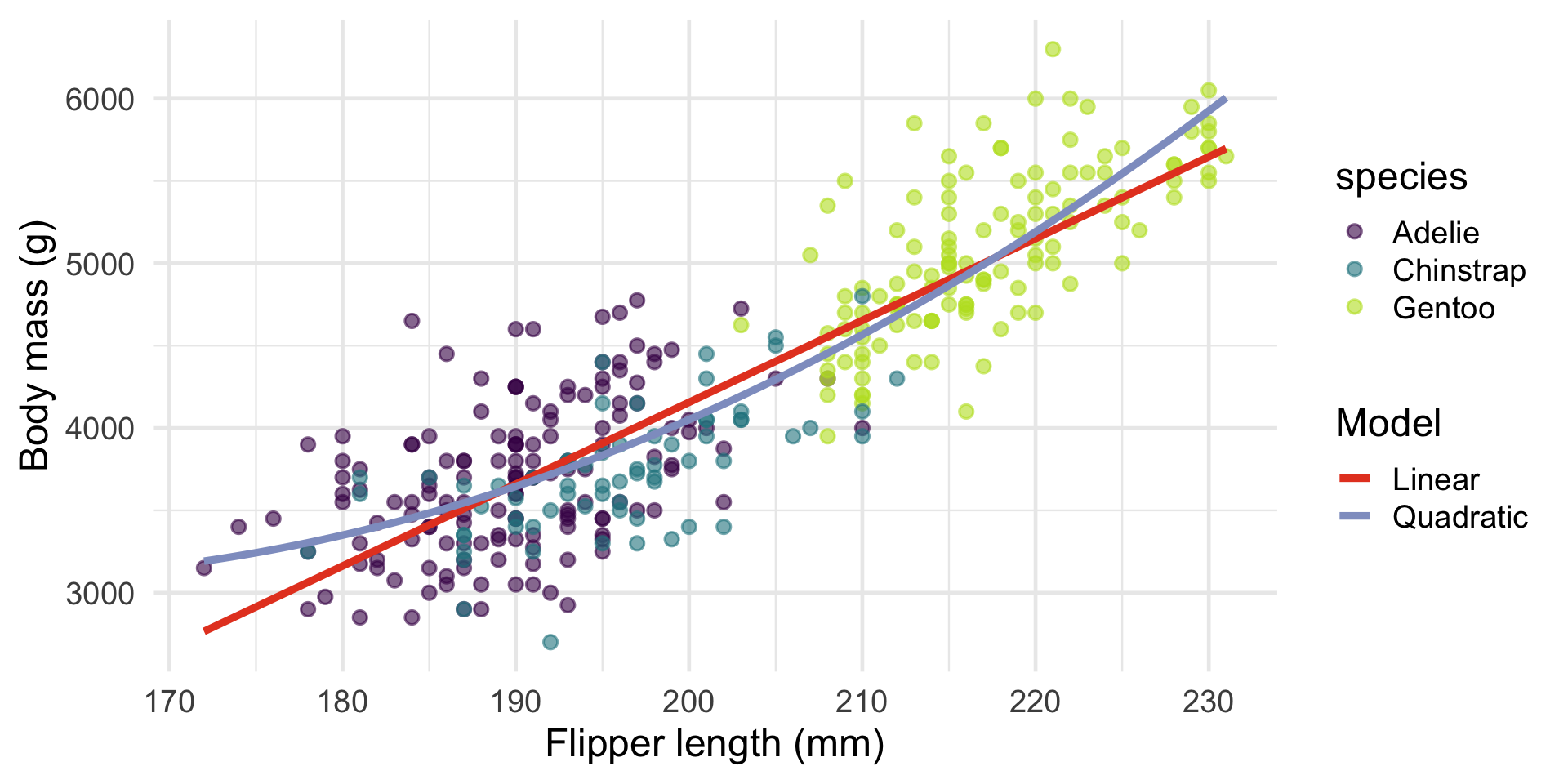 labs(x = "Flipper length (mm)", y = "Body mass (g)", linetype = "Model") +