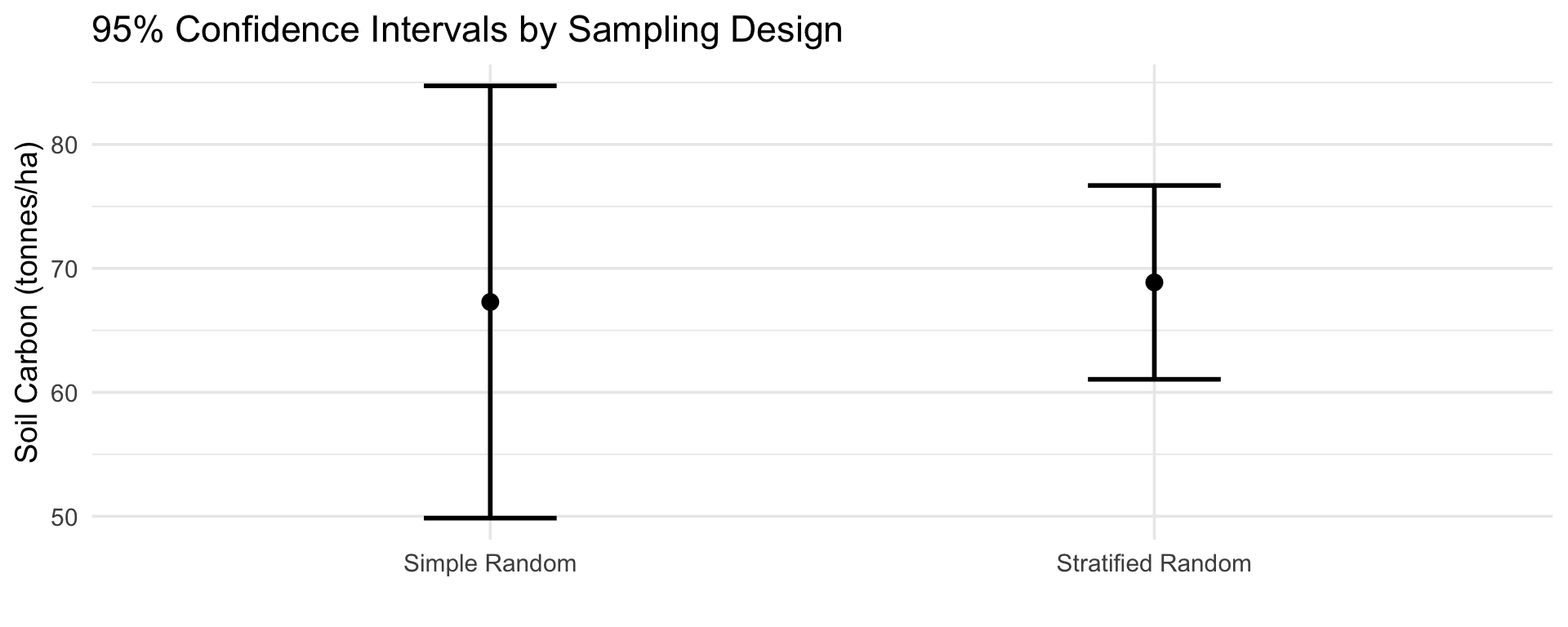 The farmer sampled the same 7 locations using a stratified design. How do the results compare to simple random sampling?