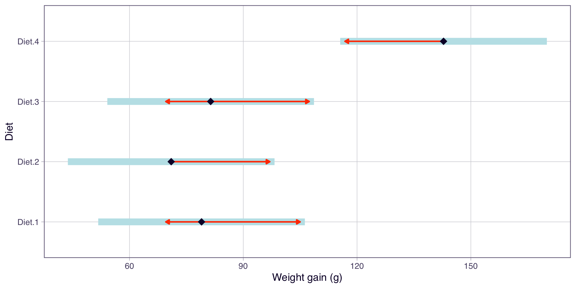 labs(title = "Four group means", x = "Diet", y = "Weight gain (g)") +