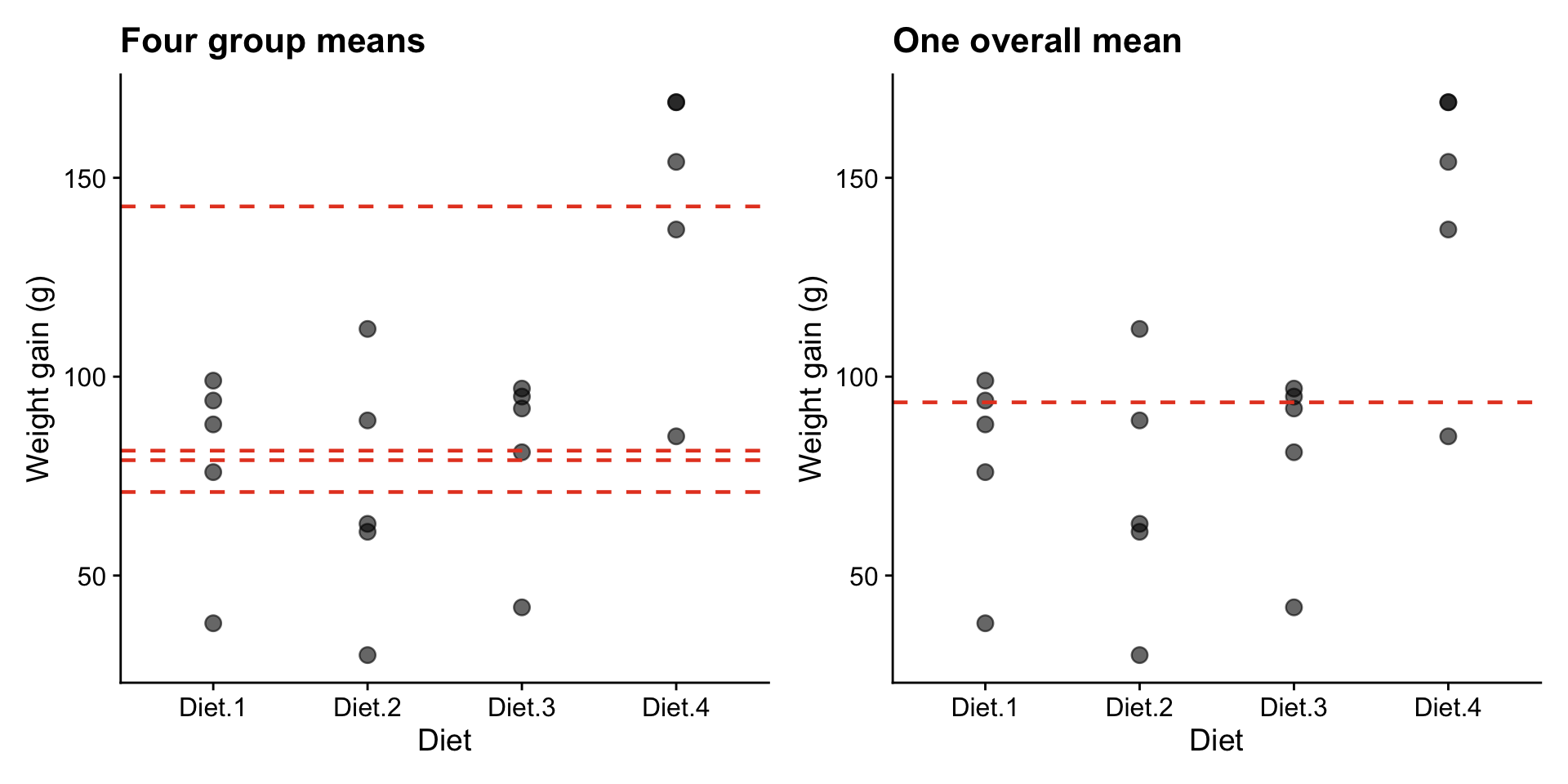 p1 + p2Do four separate means (left) explain the data better than a single overall mean (right)?