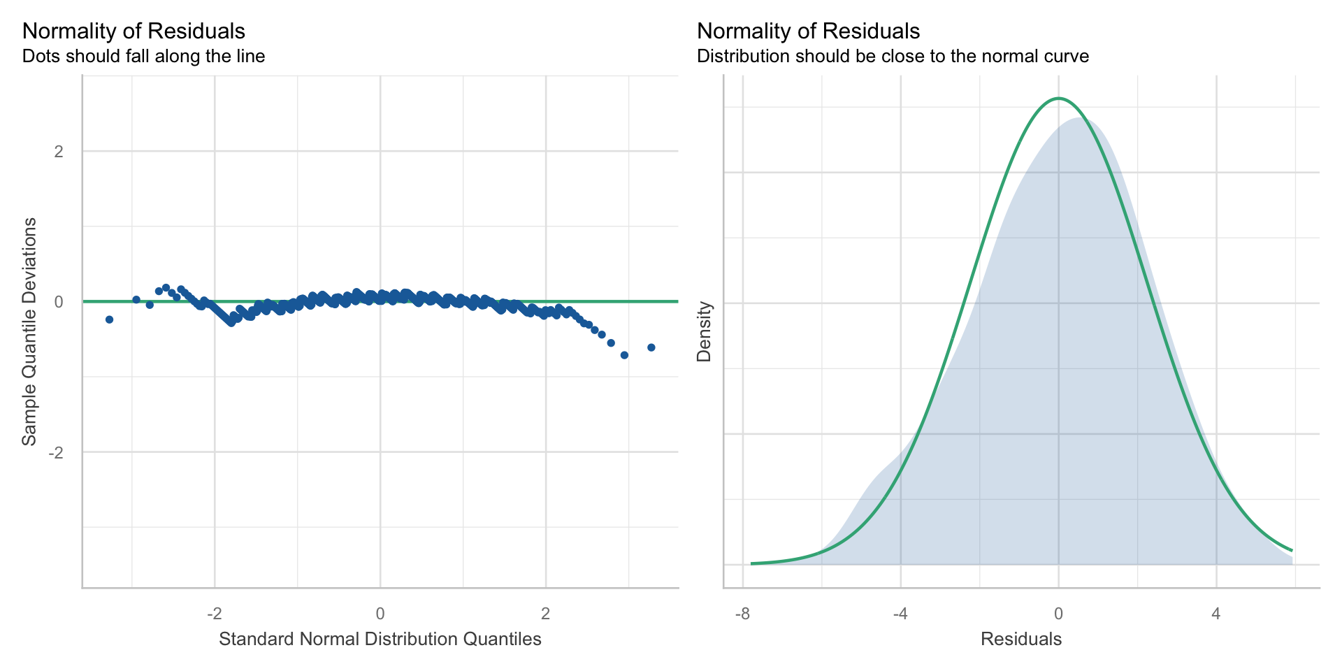 For a given value of \(x\), the residuals should be normally distributed. In a scatterplot of \(x\) and \(y\), the points would appear evenly distributed (linear and no fanning).