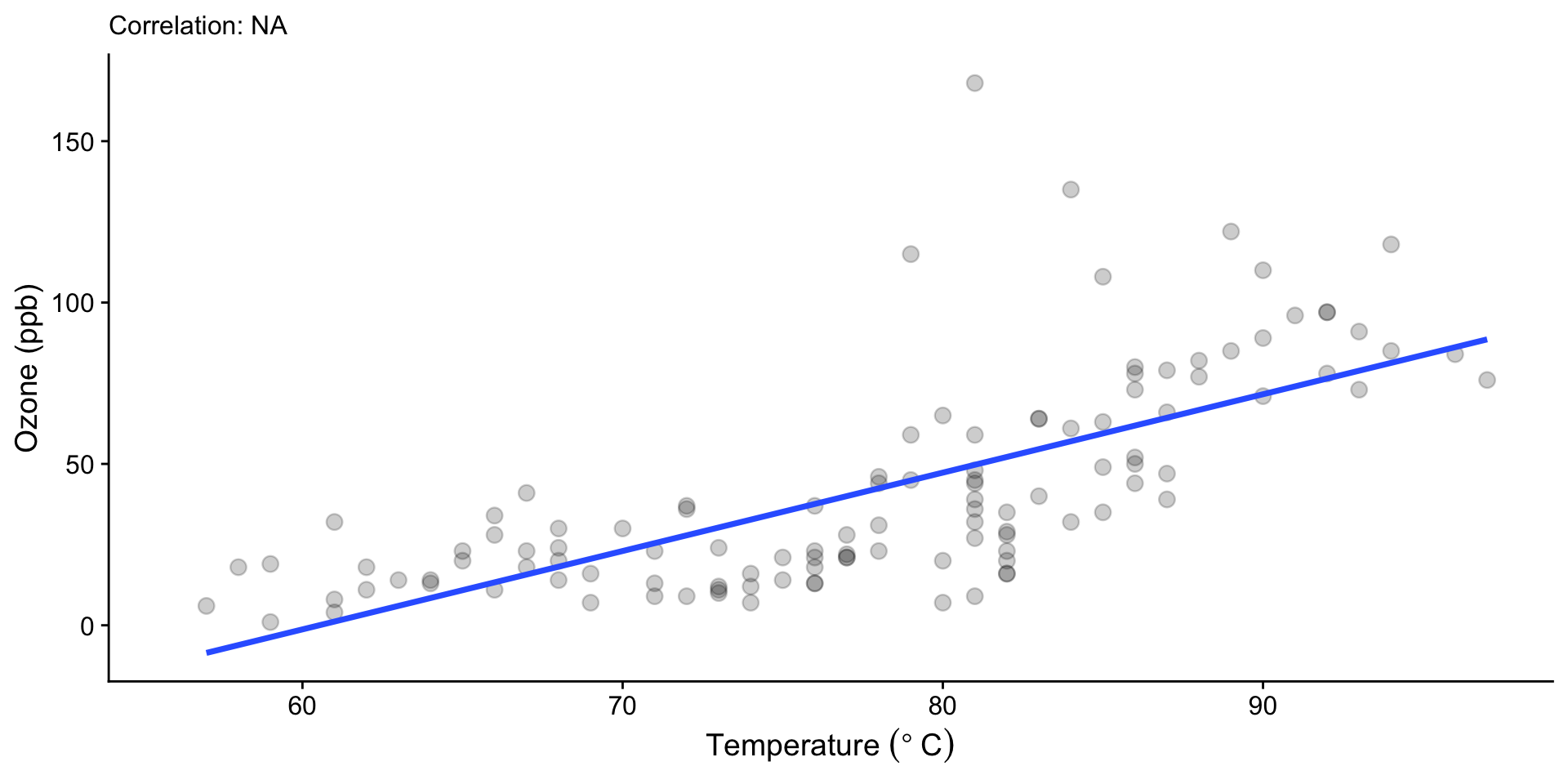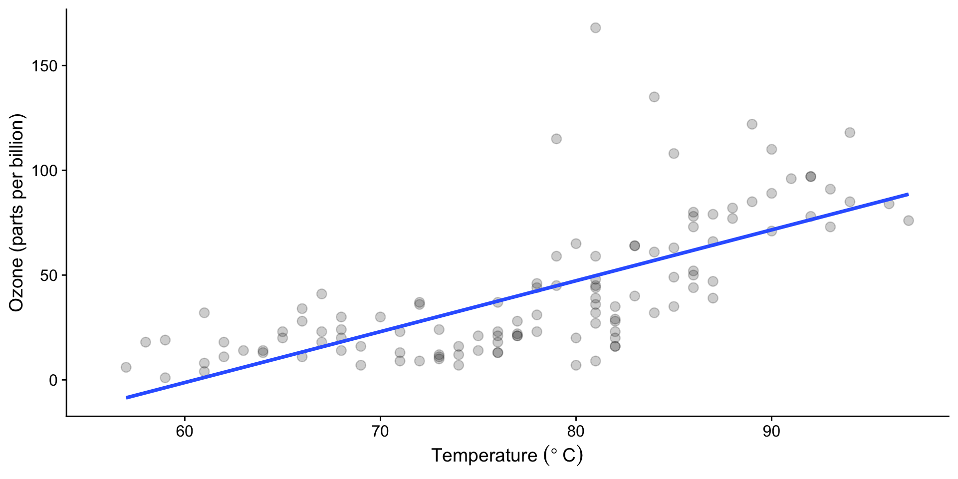 lm(formula = Ozone ~ Temp, data = airquality)