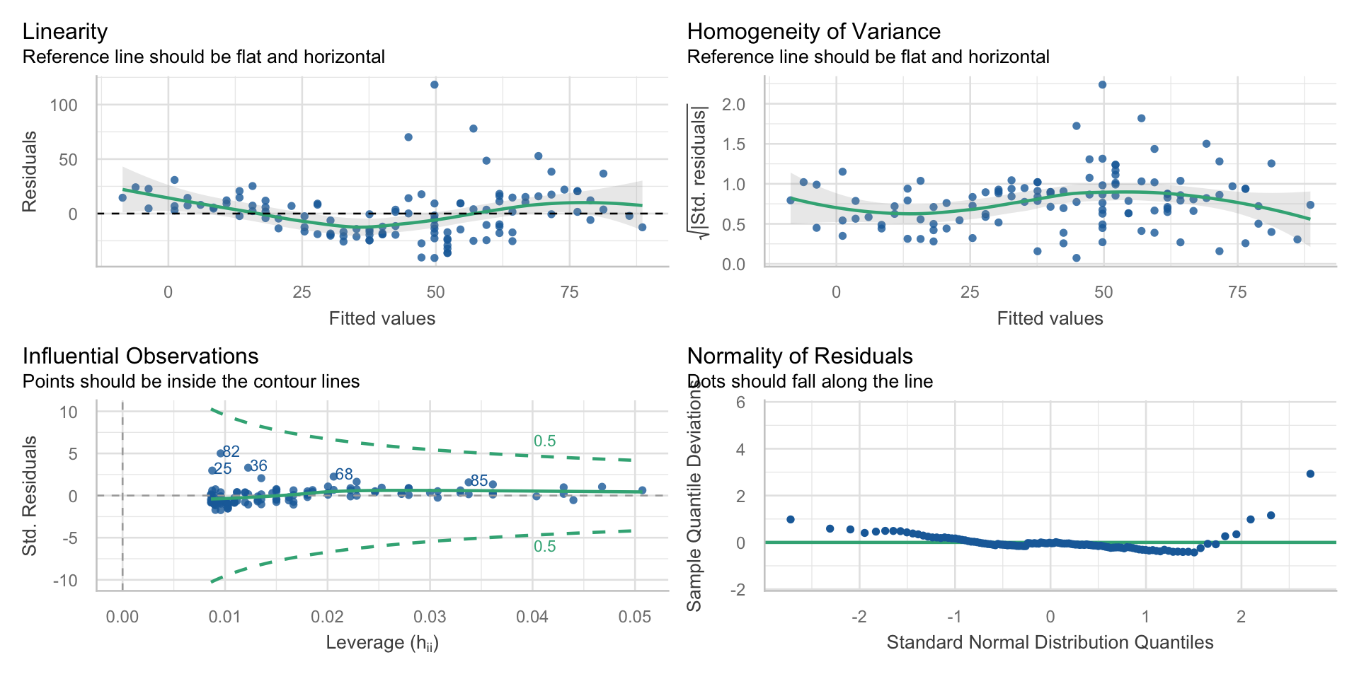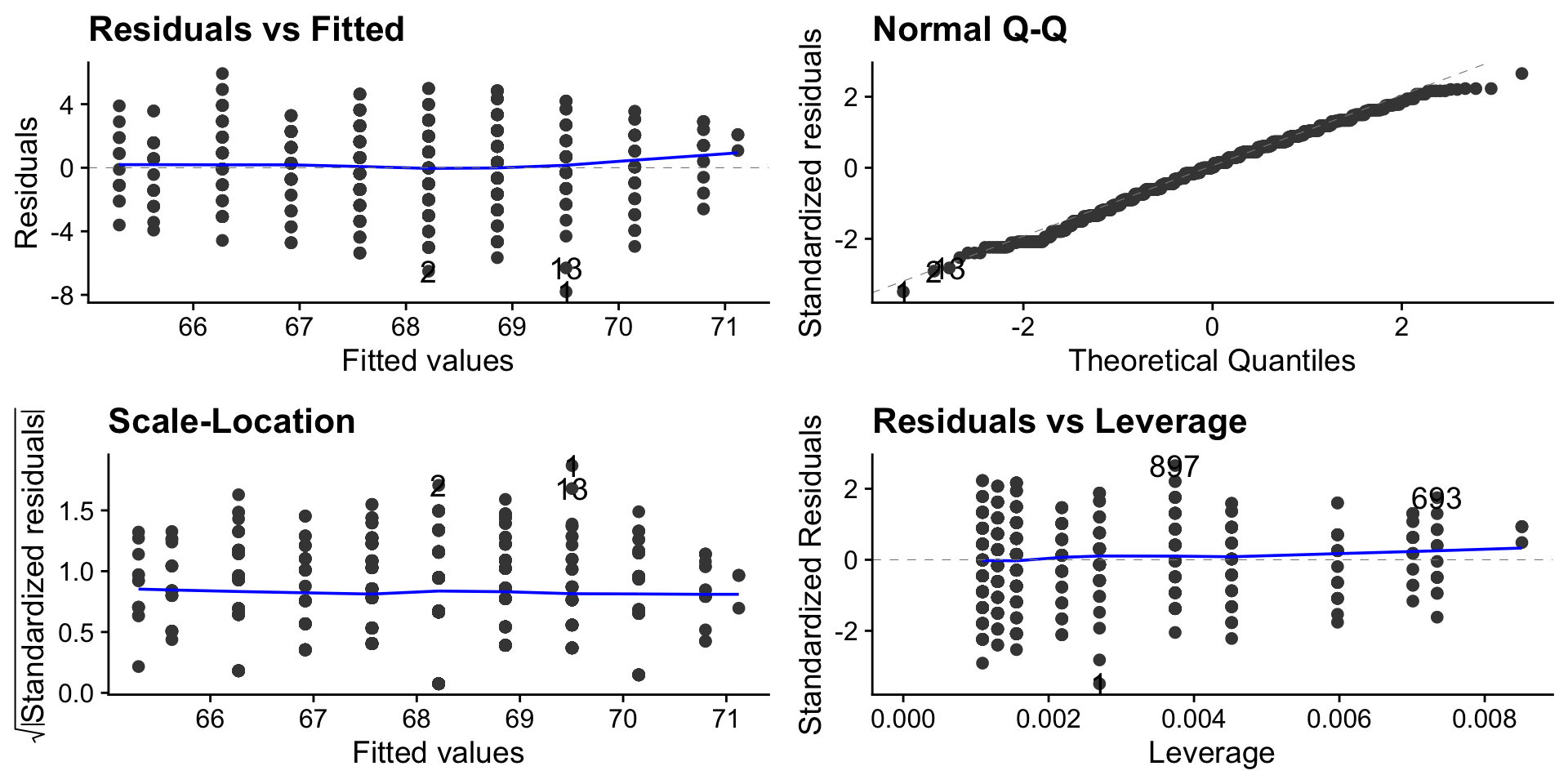 plot()ggfortify package and autoplot()performance(Also provides a guide on what to check for in the assumption plot)