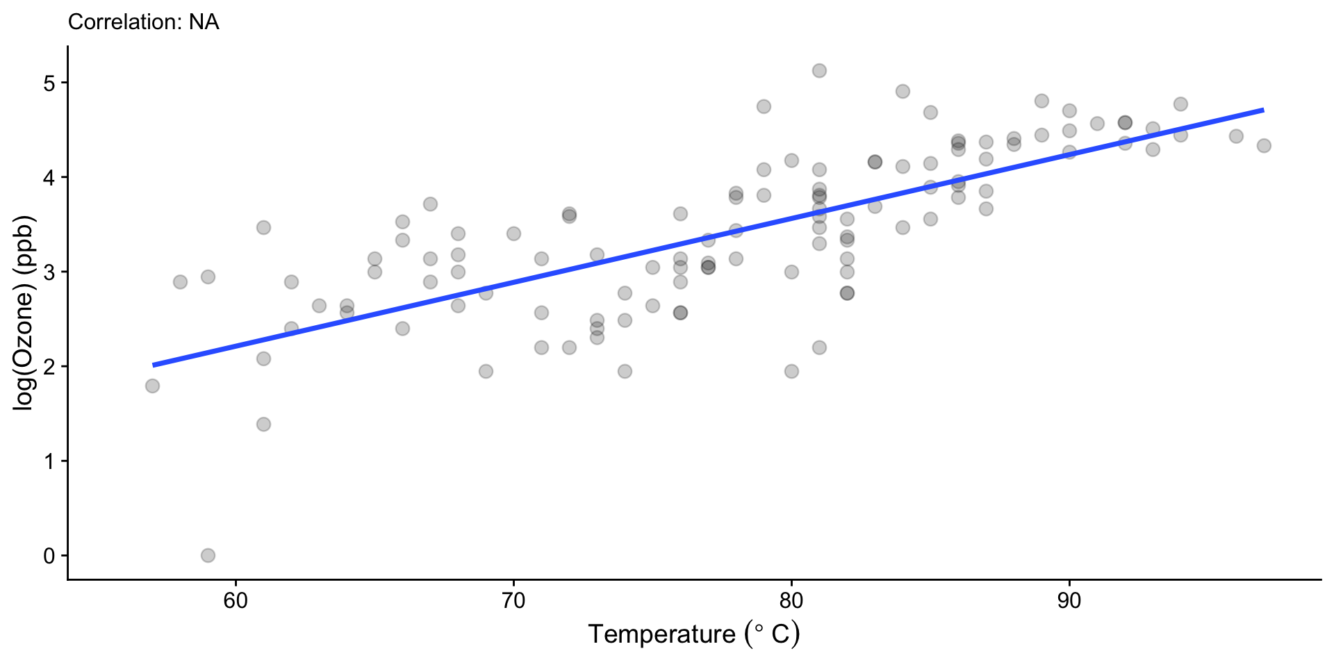 lm(formula = log(Ozone) ~ Temp, data = airquality)