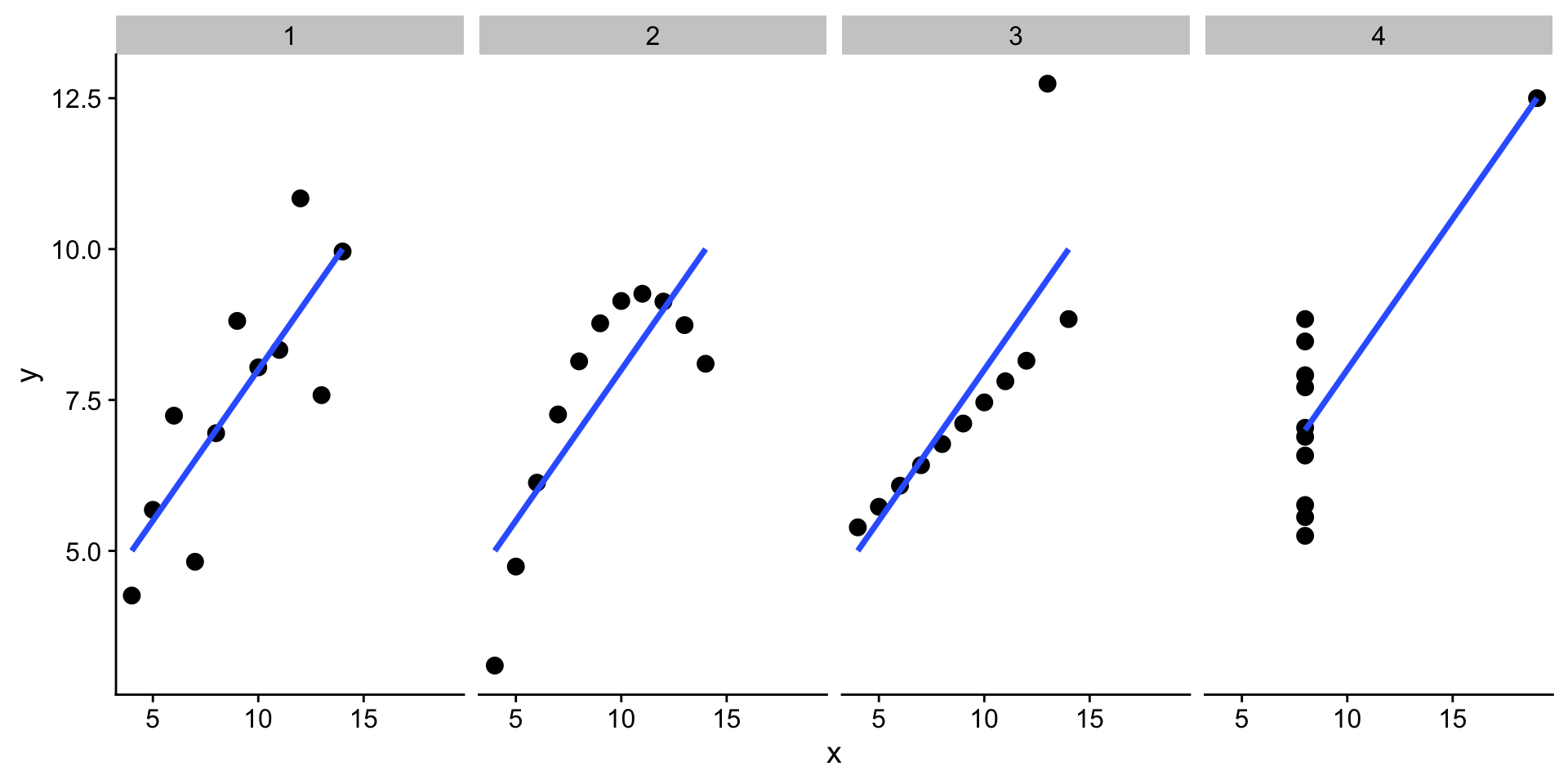 All of these data have a correlation coefficient of about 0.8 – always visualise your data.