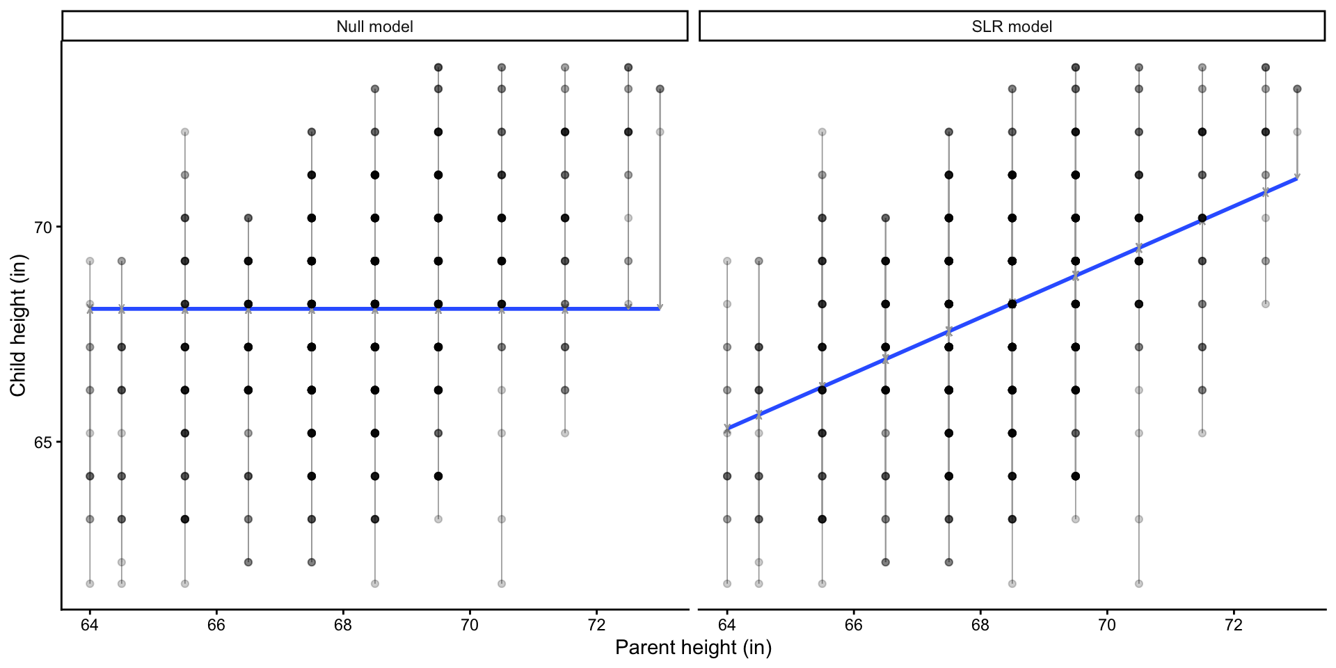mutate(model = rep(c("Null model", "SLR model"), each = nrow(Galton)))