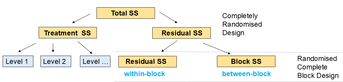 - Analyse a randomised complete block design (RCBD) and calculate the percentage of variation explained by treatments and blocks.